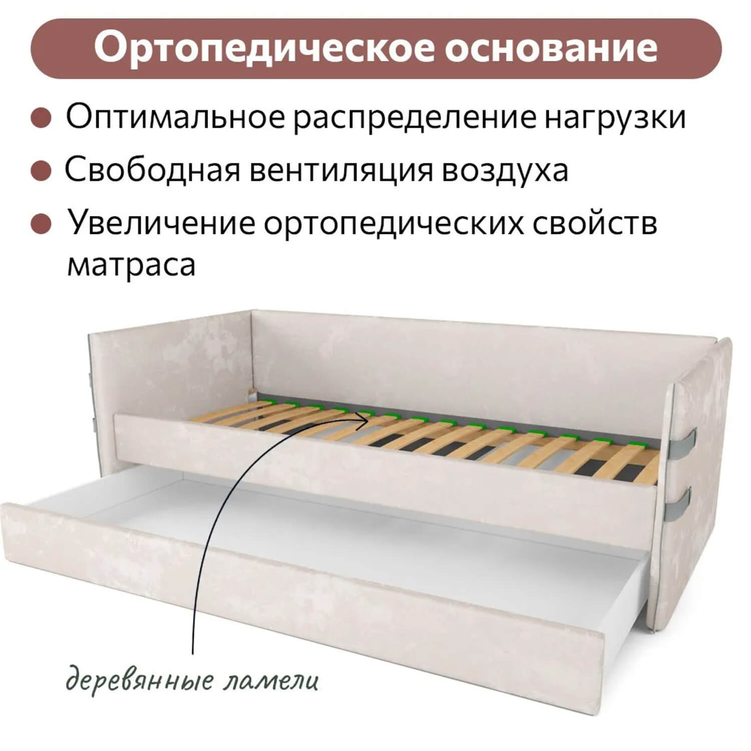 Реечное основание кровати из гибких деревянных ламелей, обеспечивает ортопедический эффект, распределяя нагрузку и поддерживая тело в правильном положении во время сна. Улучшает вентиляцию матраса, предотвращая накопление влаги и пыли.