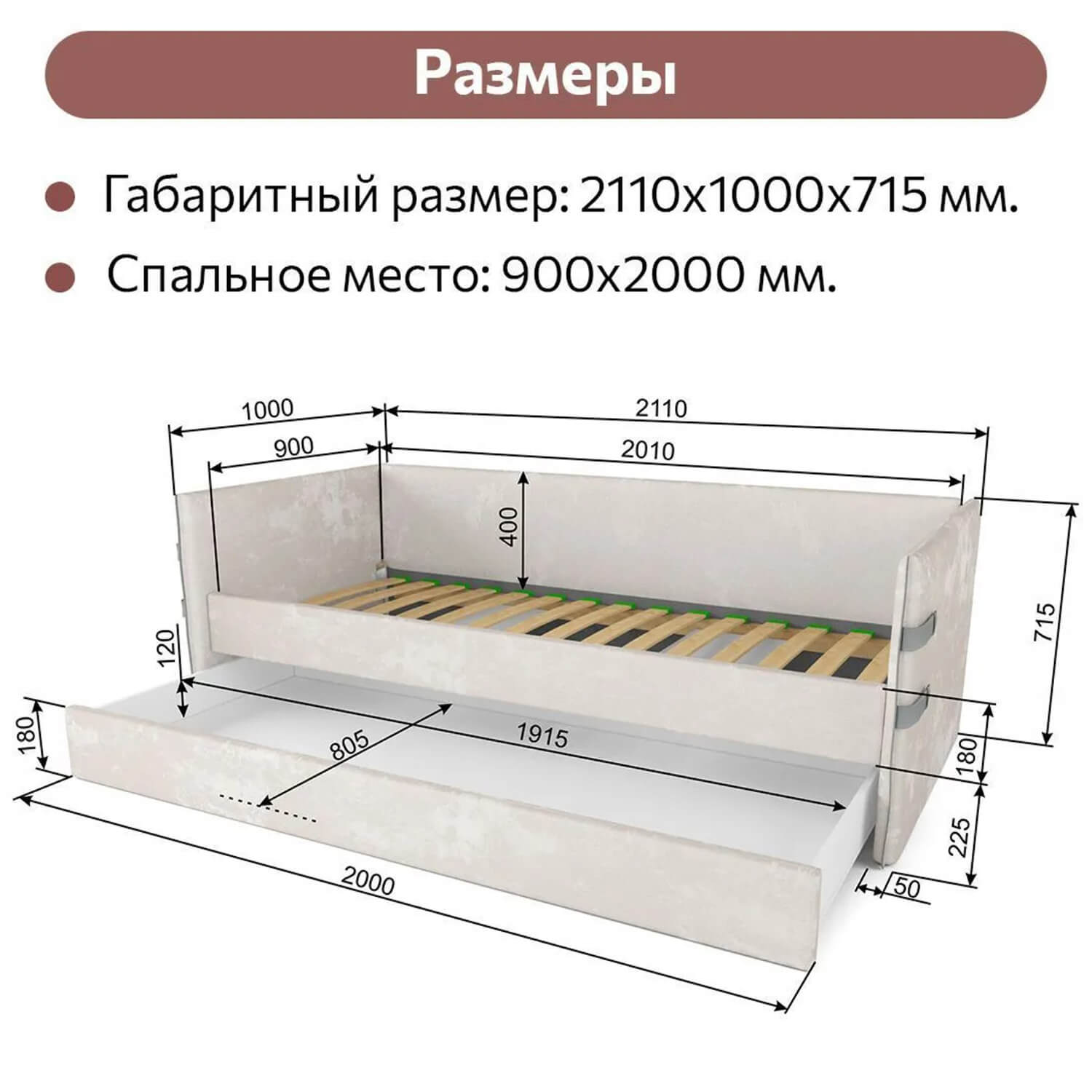 Размер дополнительного спального места: 1900*900 мм.