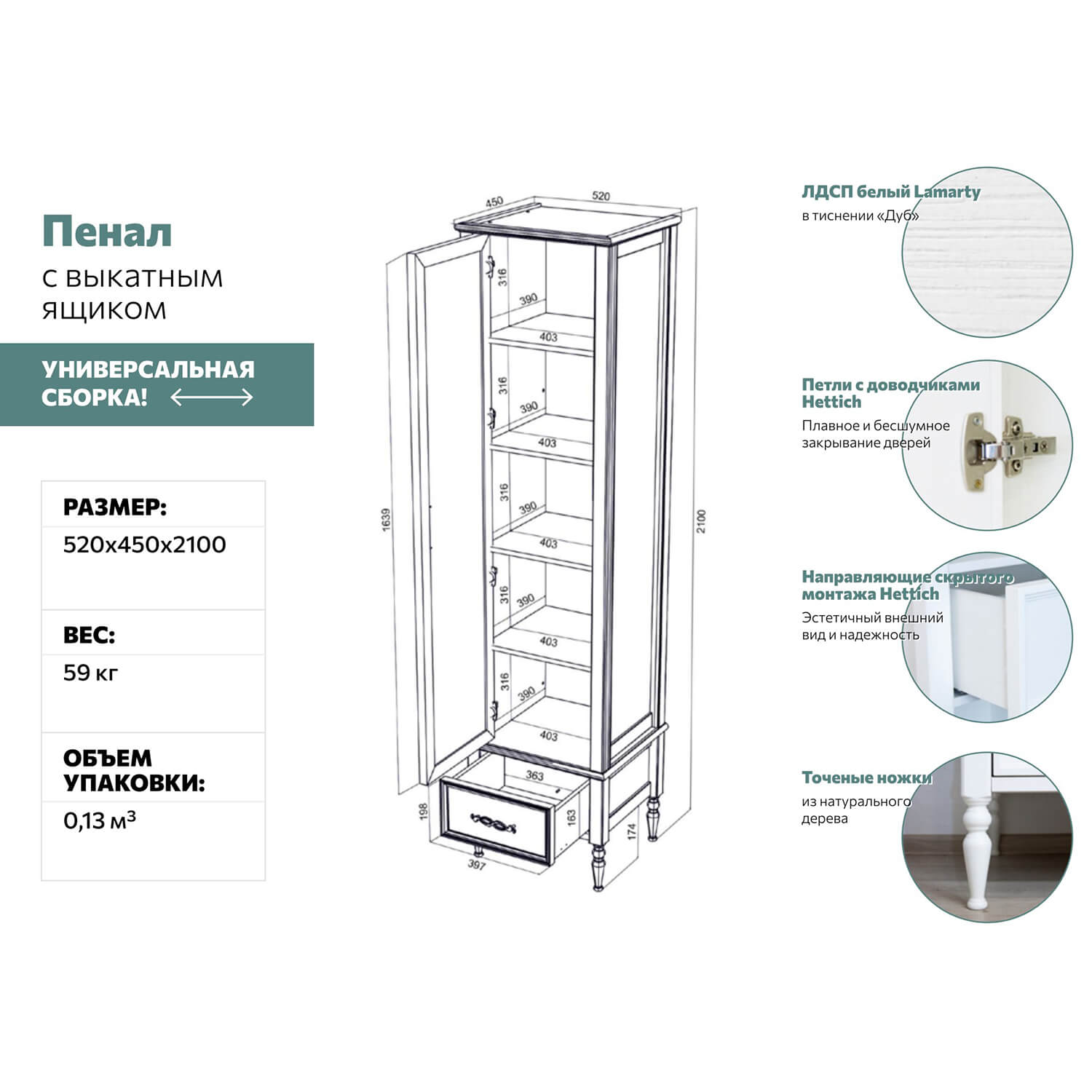 Корпус ЛДСП 16 мм. Опоры: массив березы Фасады: рамочные. Рамка - МДФ в пленке, вставка - ЛДСП 10 мм. Фурнитура: Ручка-скоба металлическая Направляющие шариковые полного выдвижения.