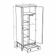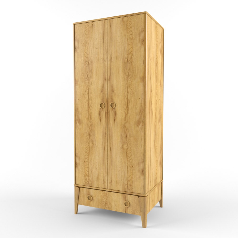 Шкаф двухстворчатый с выкатным ящиком. Корпус: ЛДСП 16 мм. Ручки: врезные, выточенные из массива дуба. Боковые закругленные декоративные накладки из массива дуба. Опоры: массив дуба Направляющие скрытого монтажа. Цвет: дуб золотистый.