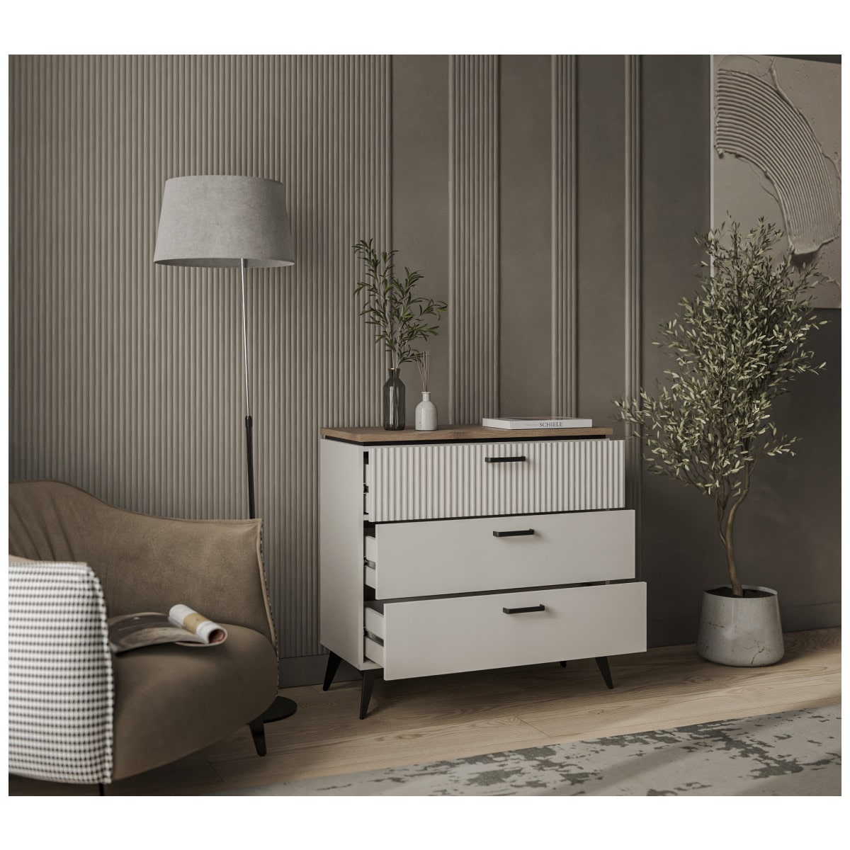 Декор в виде рифленой поверхности на фасаде подчеркивает особенность дизайна коллекции. Добавьте сюда подсветку, украсьте памятными сувенирами, семейными фотографиями и Ваш интерьер засияет поистине новыми красками.