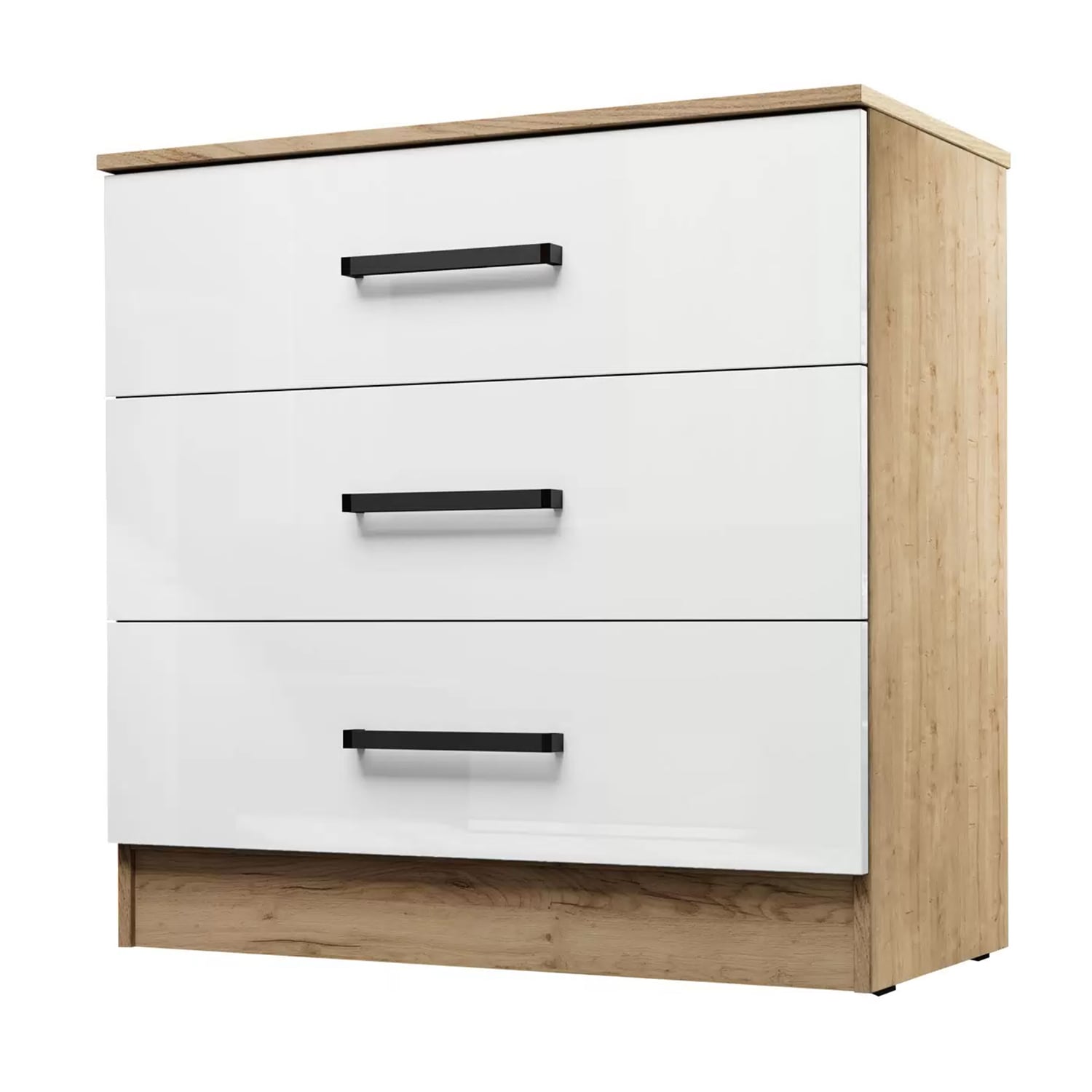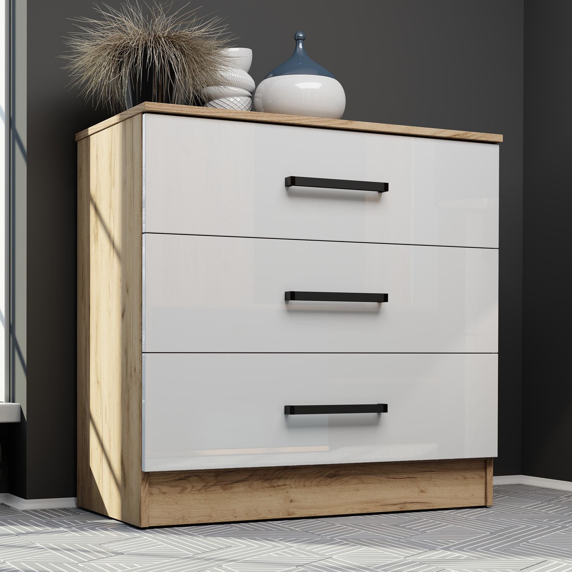 Комод оснащен тремя ящиками, что позволяет удобно разместить все необходимые вещи и аксессуары. Благодаря роликовым направляющим, ящики легко открываются и закрываются.