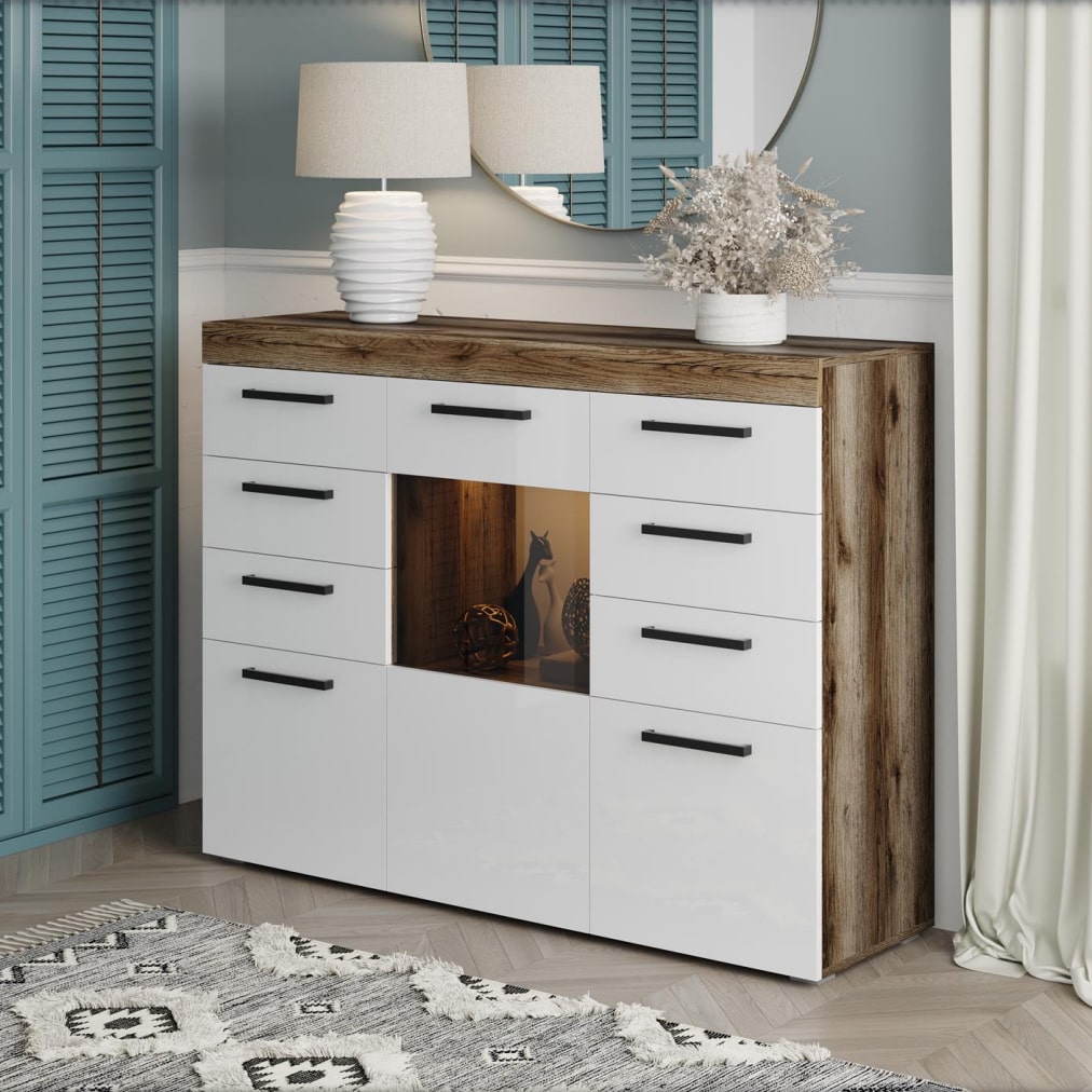 Комод “Бастон” выполнен в современном стиле и представляет собой идеальное сочетание функциональности и эстетики. Изготовлен из высококачественного материала, который придает ему прочность и долговечность. Белый глянцевый фасад комода эффектно контрастирует с темным основанием, создавая стильный и гармоничный образ.
