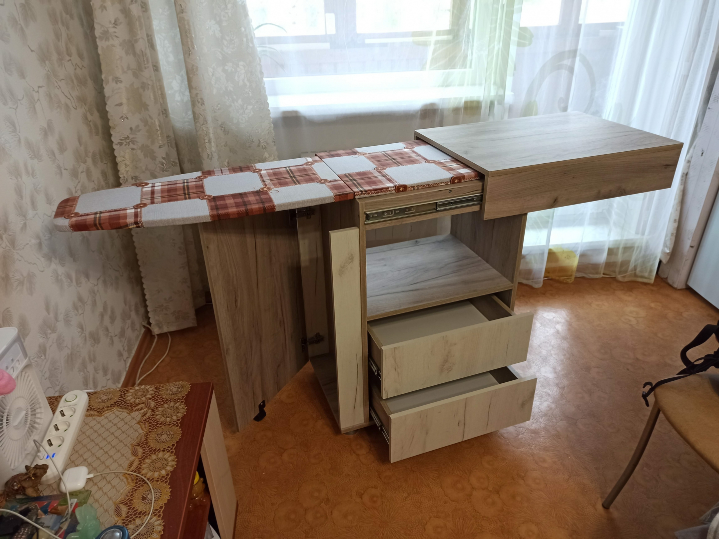 Гладильный комод 02 выполнен в бежевом оттенке шимо и без лицевой фурнитуры. Небольшая и вместительная модель станет украшением спальни или гостиной и легко решит проблему хранения большого количества вещей. Помимо двух выдвижных ящиков комод оборудован скрытой раздвижной столешницей над гладильной поверхностью и складной секцией на поворотно-выкатной опоре.