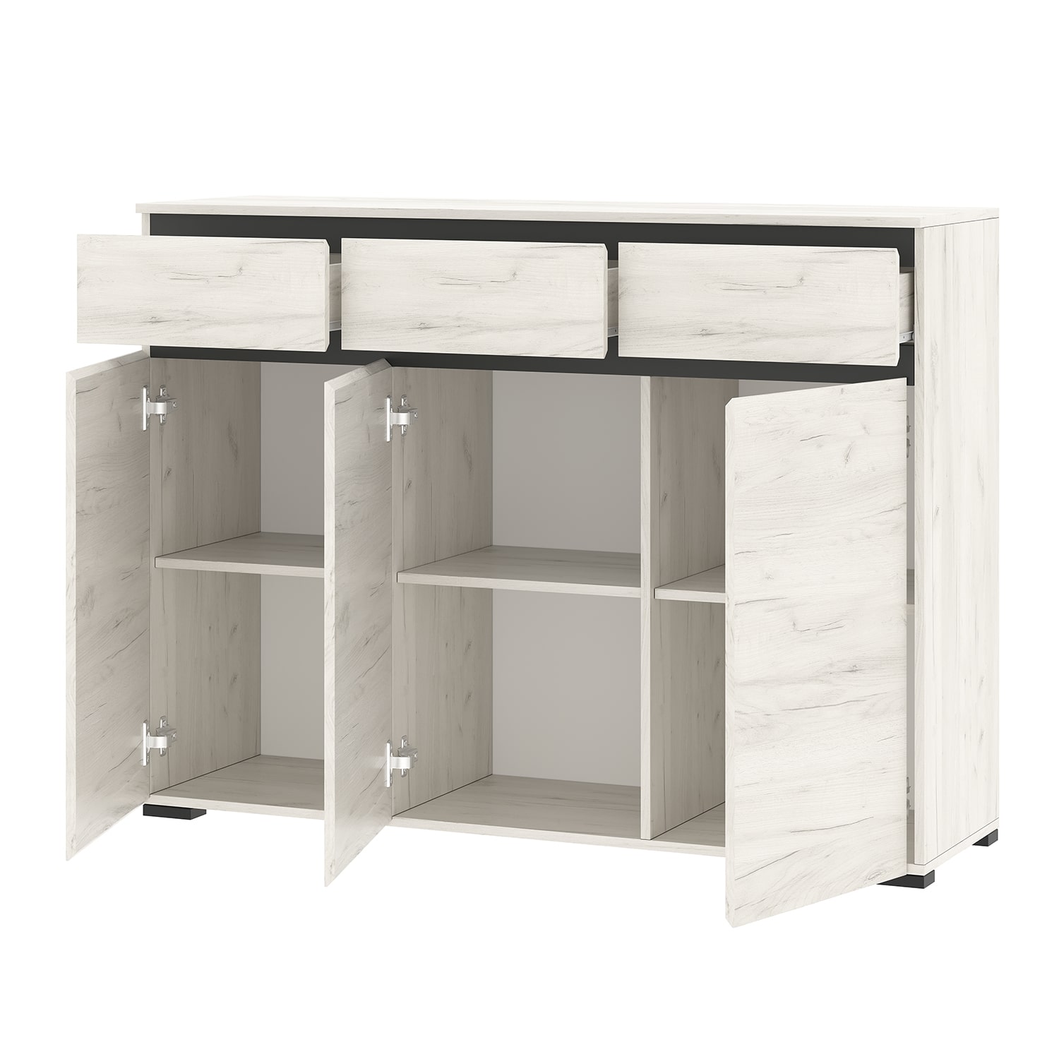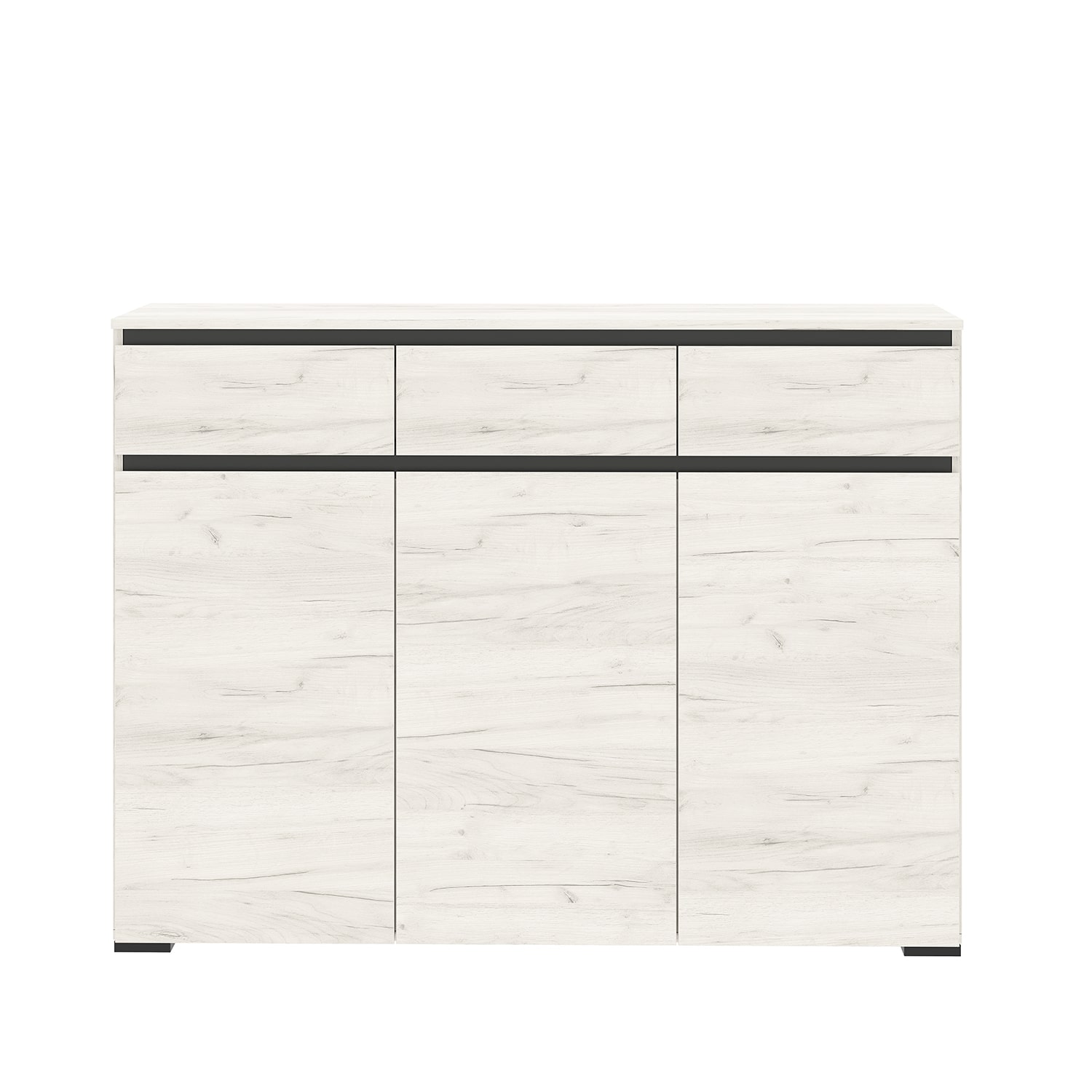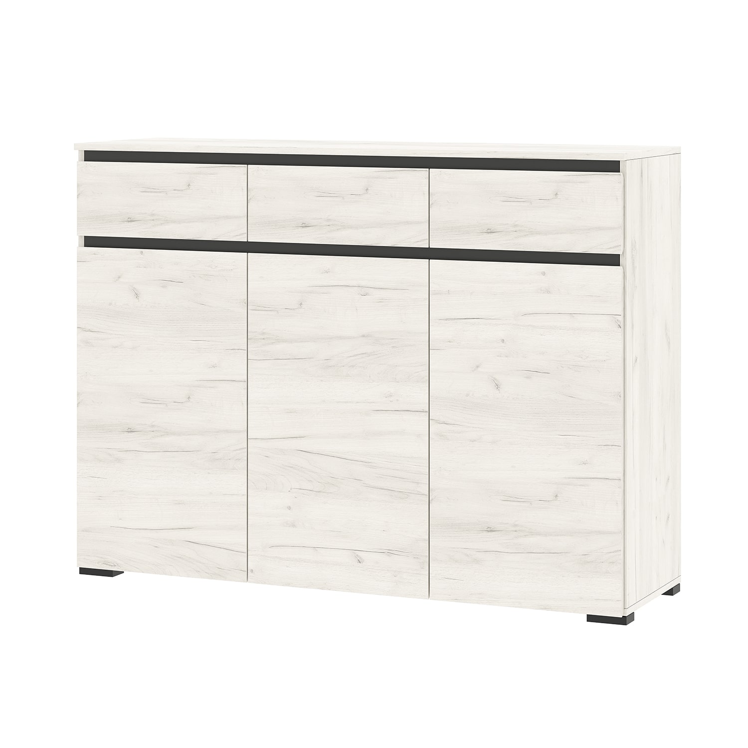 Комод Гретта 3-створчатый с 3-мя ящиками на направляющих полного выдвижения. Применение интегрированной ручки на фасадах делает модель стильной и безопасной – дверцы открываются за профилированные выступы. Фасады обработаны кромкой 1 мм.