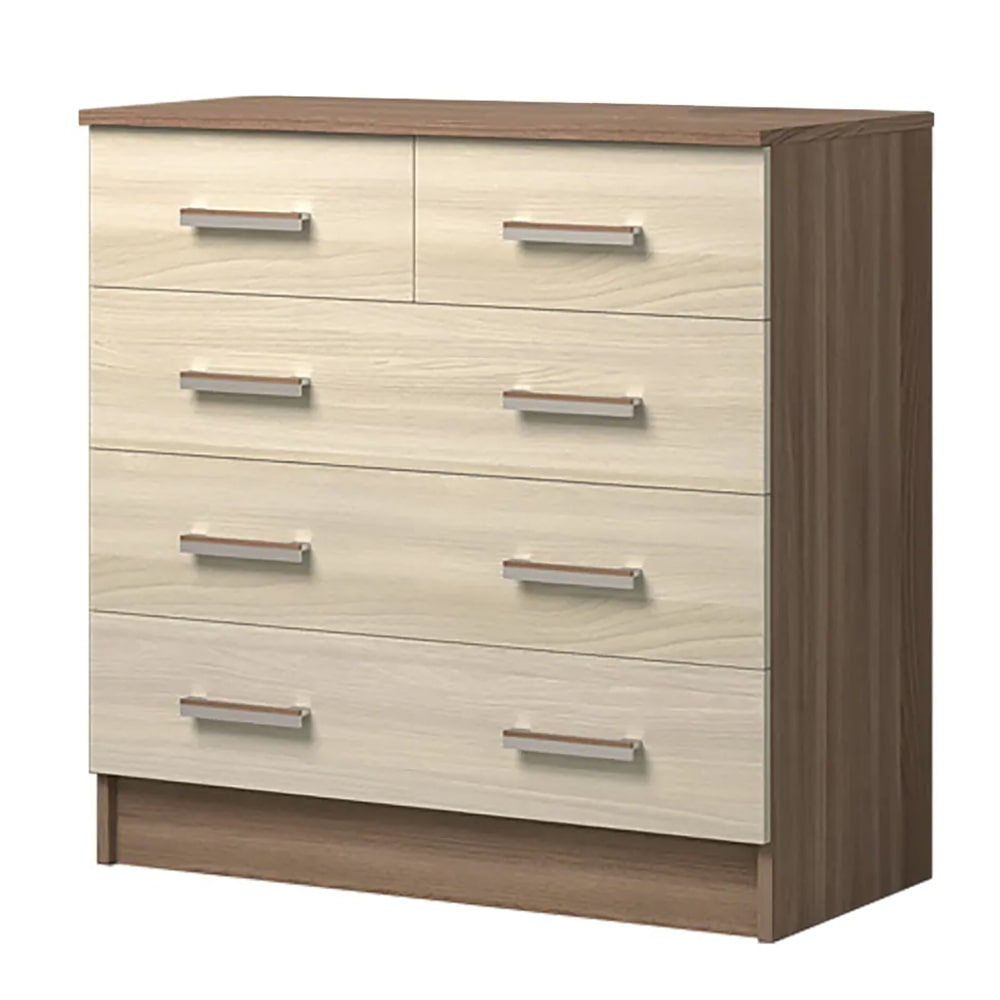 Комод оснащен пятью ящиками с роликовыми направляющими, что обеспечивает плавное и бесшумное открывание и закрывание.