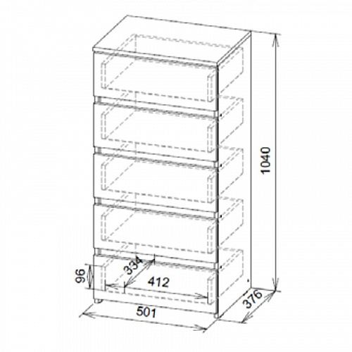 Комод c пятью выкатными ящиками на шариковых направляющих. Фасад накладной. Сборка корпуса не универсальная. Максимальная нагрузка на крышку - 10кг. Максимальная нагрузка на ящик - 5кг.