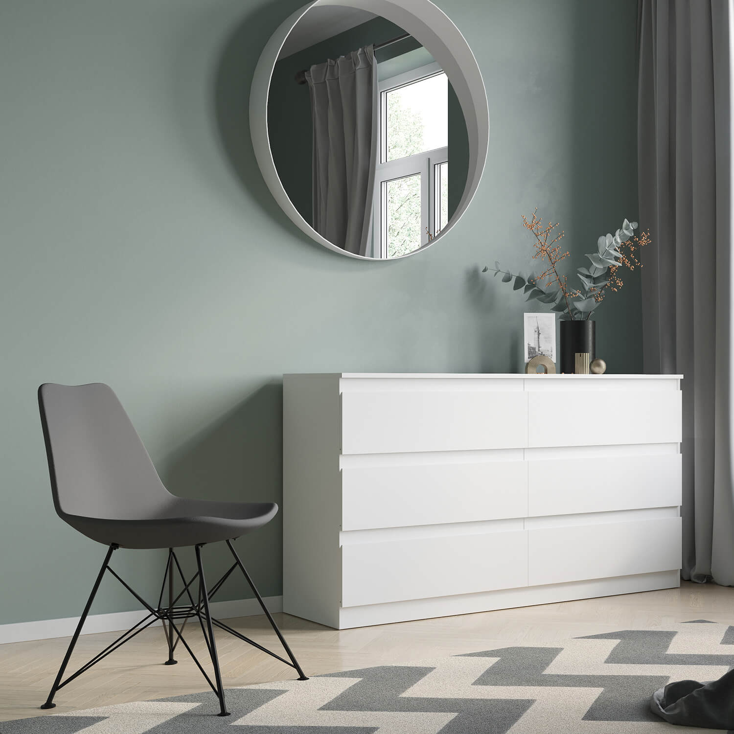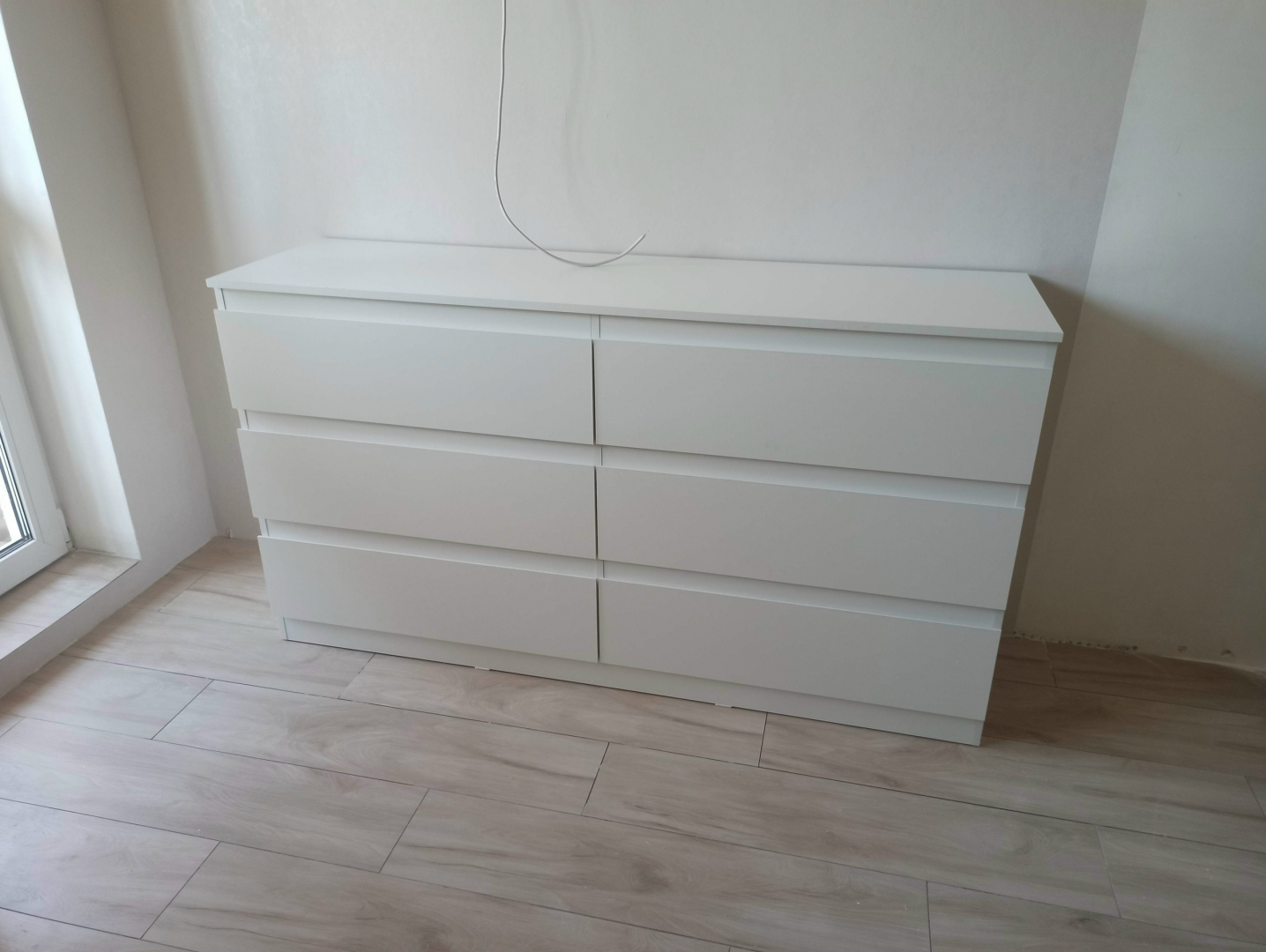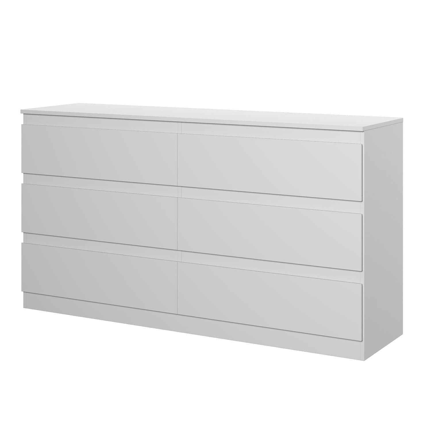 Комод оснащен шестью ящиками с роликовыми направляющими, что обеспечивает плавное и бесшумное открывание и закрывание.