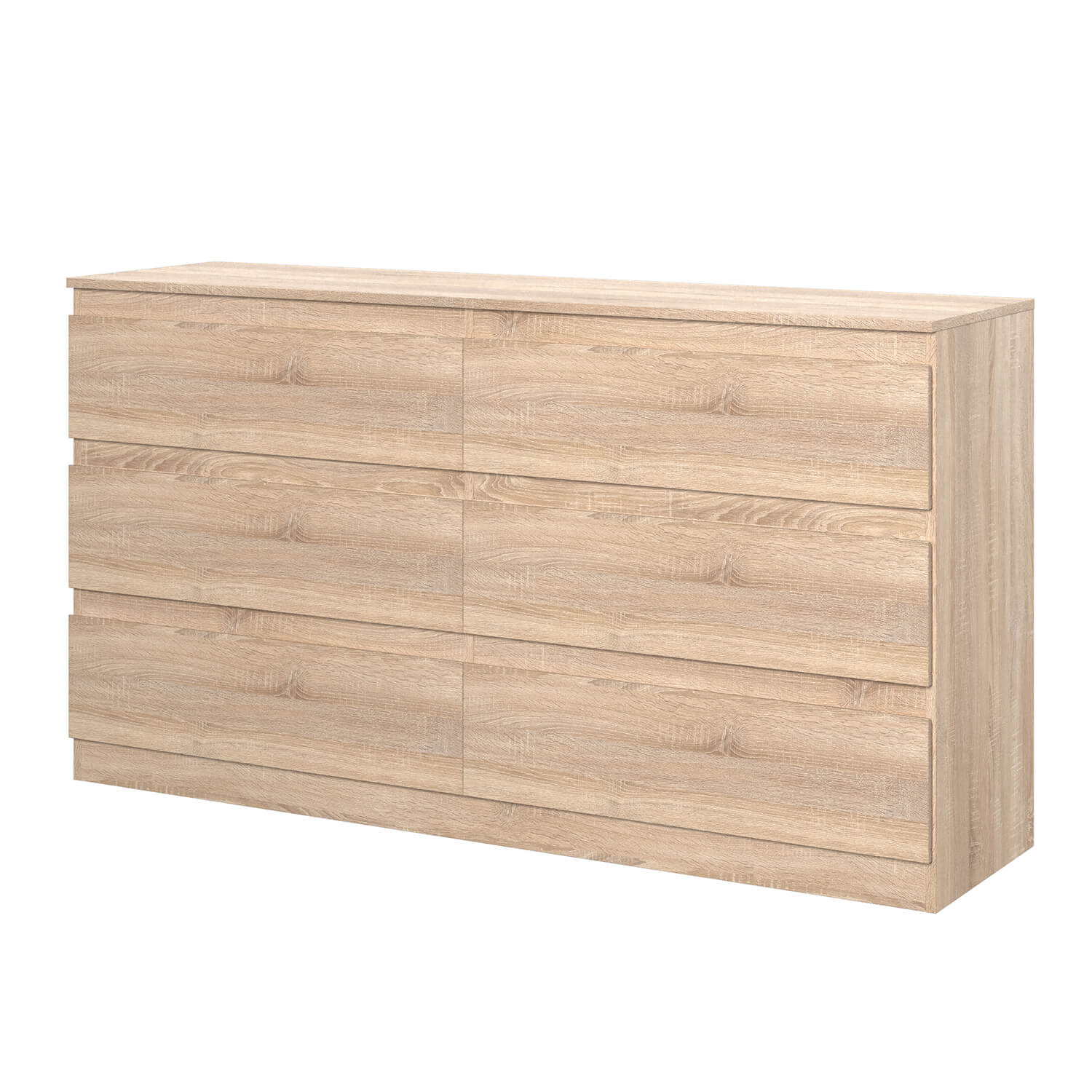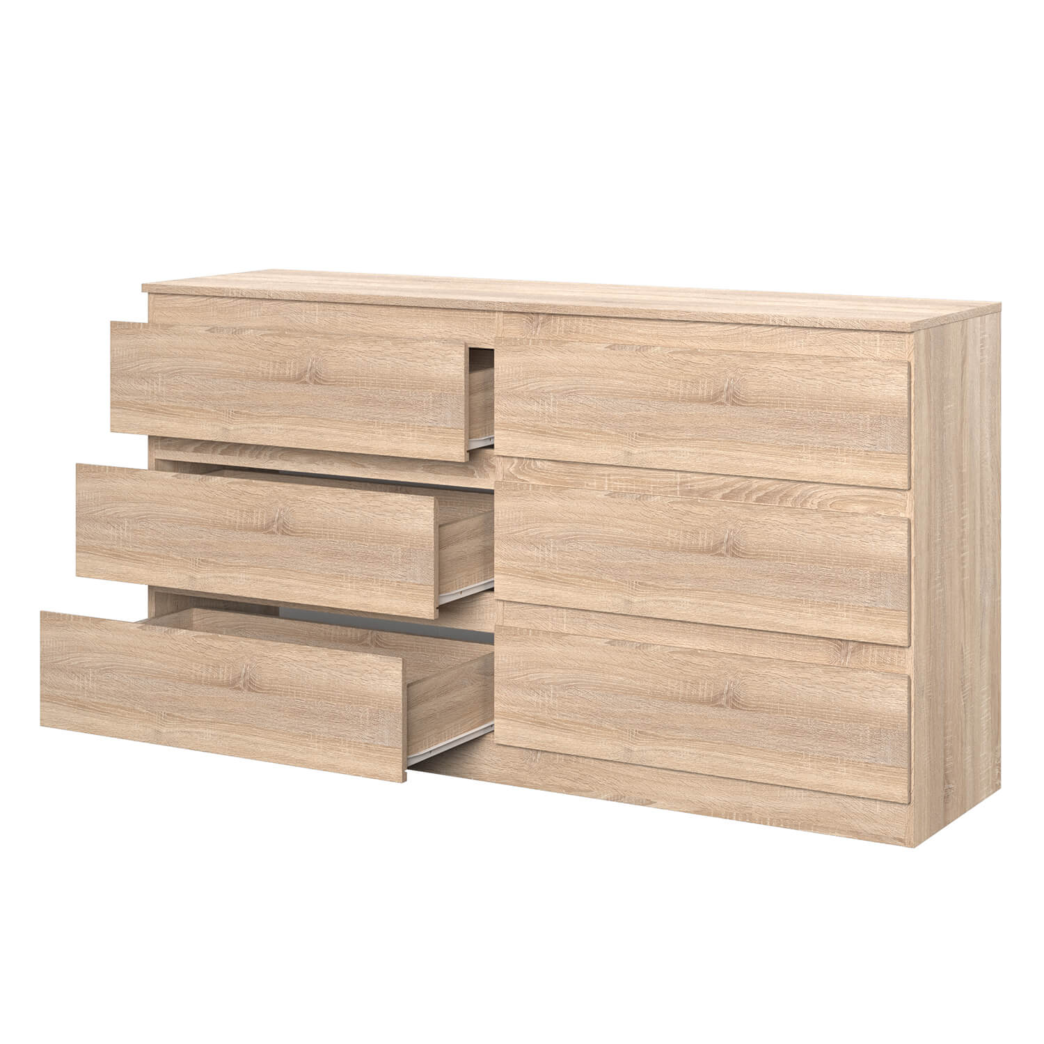 Комод оснащен шестью ящиками с роликовыми направляющими, что обеспечивает плавное и бесшумное открывание и закрывание.