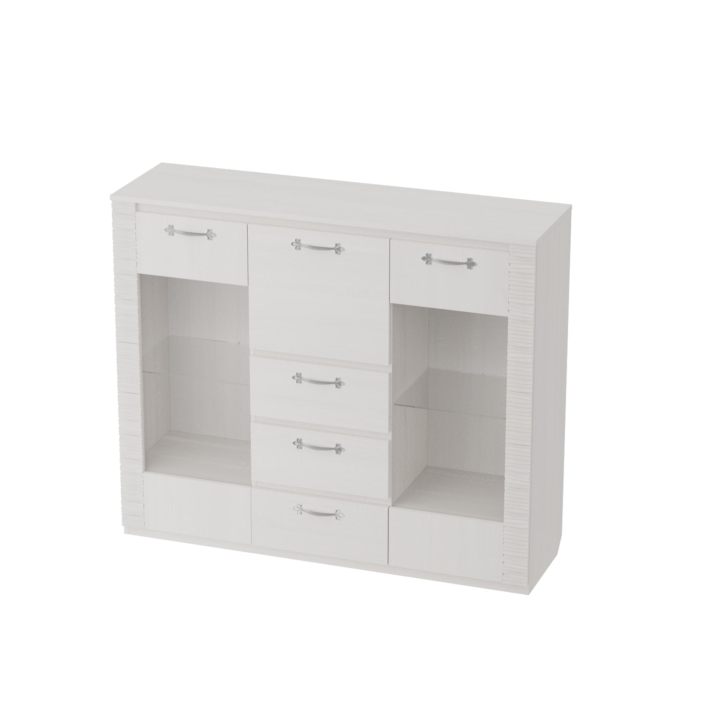 По центру комода располагаются три ящика на роликовых направляющих, над которыми имеется отделение бара закрытое глухой дверцей. Боковые отделения закрыты распашными дверцами со стеклом. Каждое из отделений оснащено двумя стационарными полками и съёмной стеклянной полкой, на которую можно установить светильник.