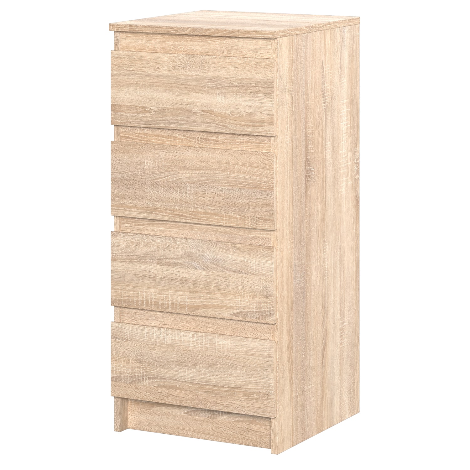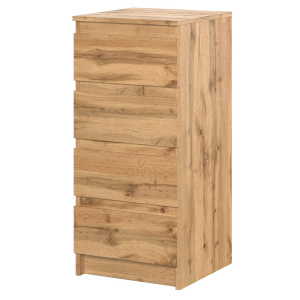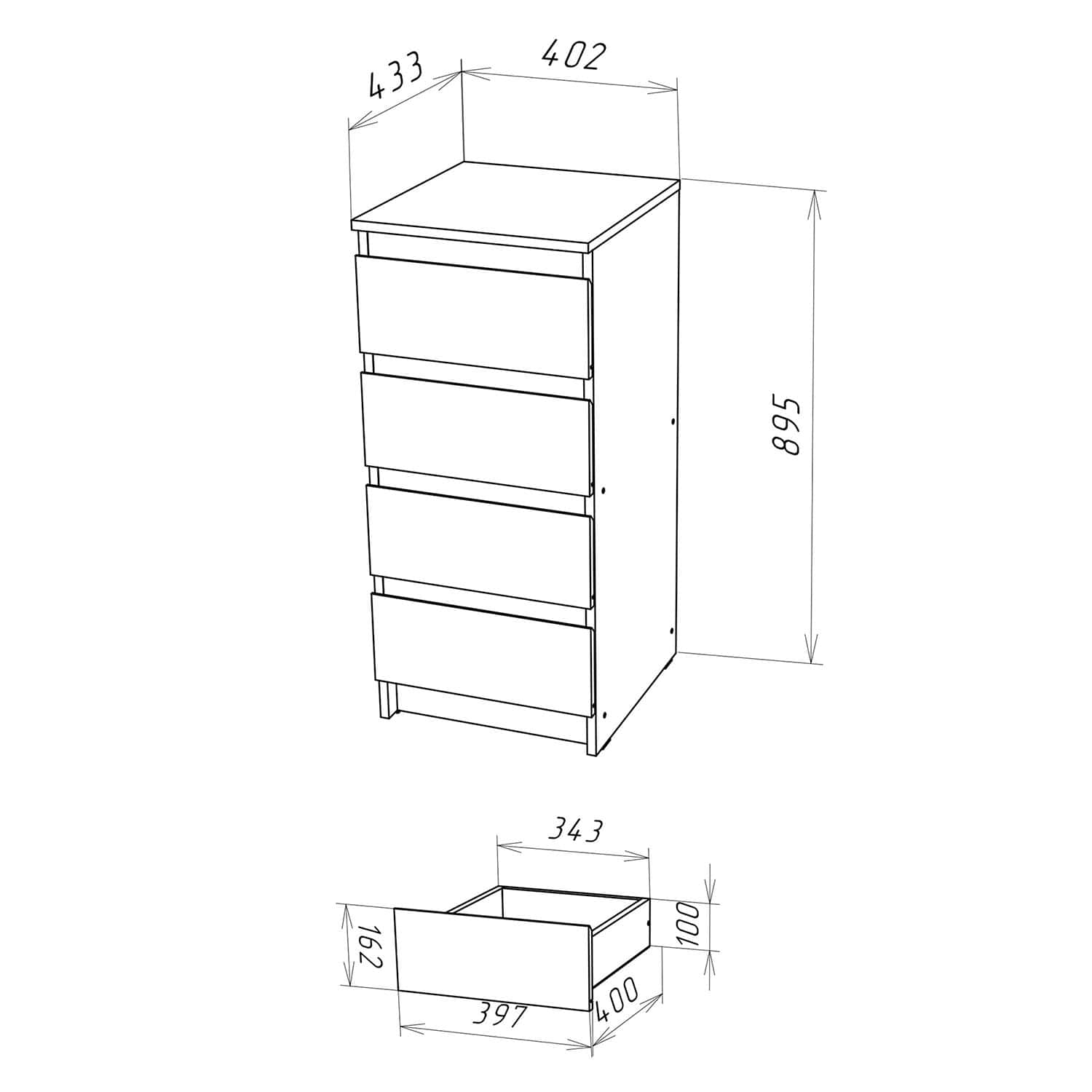 Комод оснащен четырьмя ящиками с роликовыми направляющими, что обеспечивает плавное и бесшумное открывание и закрывание.