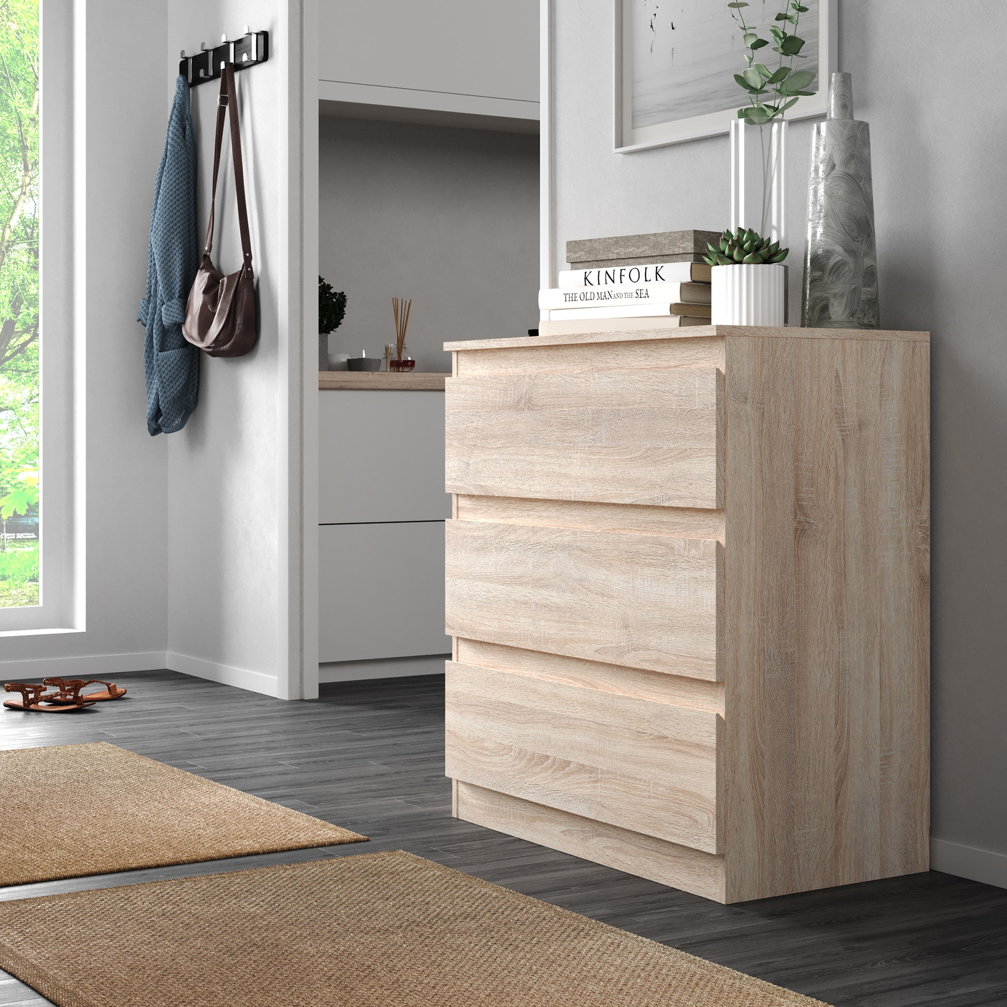 Комод оснащен тремя ящиками, что позволяет удобно разместить белье, одежду или другие предметы. Скошенные ручки на фасадах делают использование комода еще более комфортным.