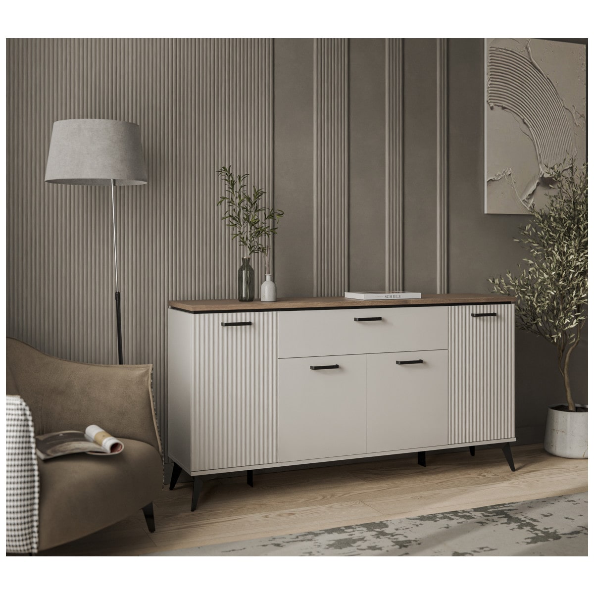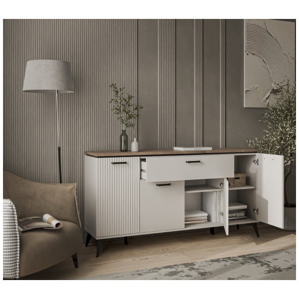 Декор в виде рифленой поверхности на фасаде подчеркивает особенность дизайна коллекции. Добавьте сюда подсветку, украсьте памятными сувенирами, семейными фотографиями и Ваш интерьер засияет поистине новыми красками.