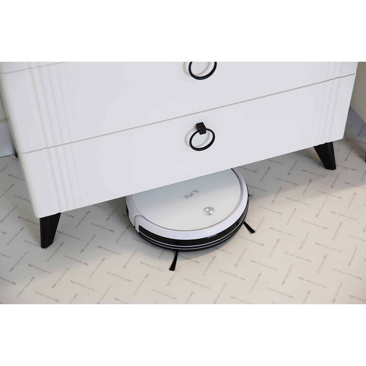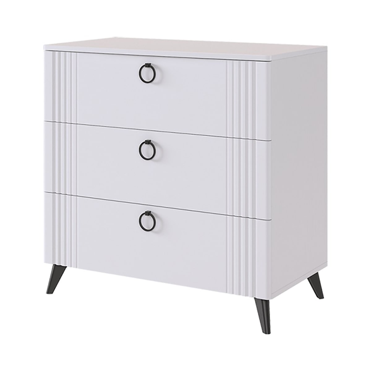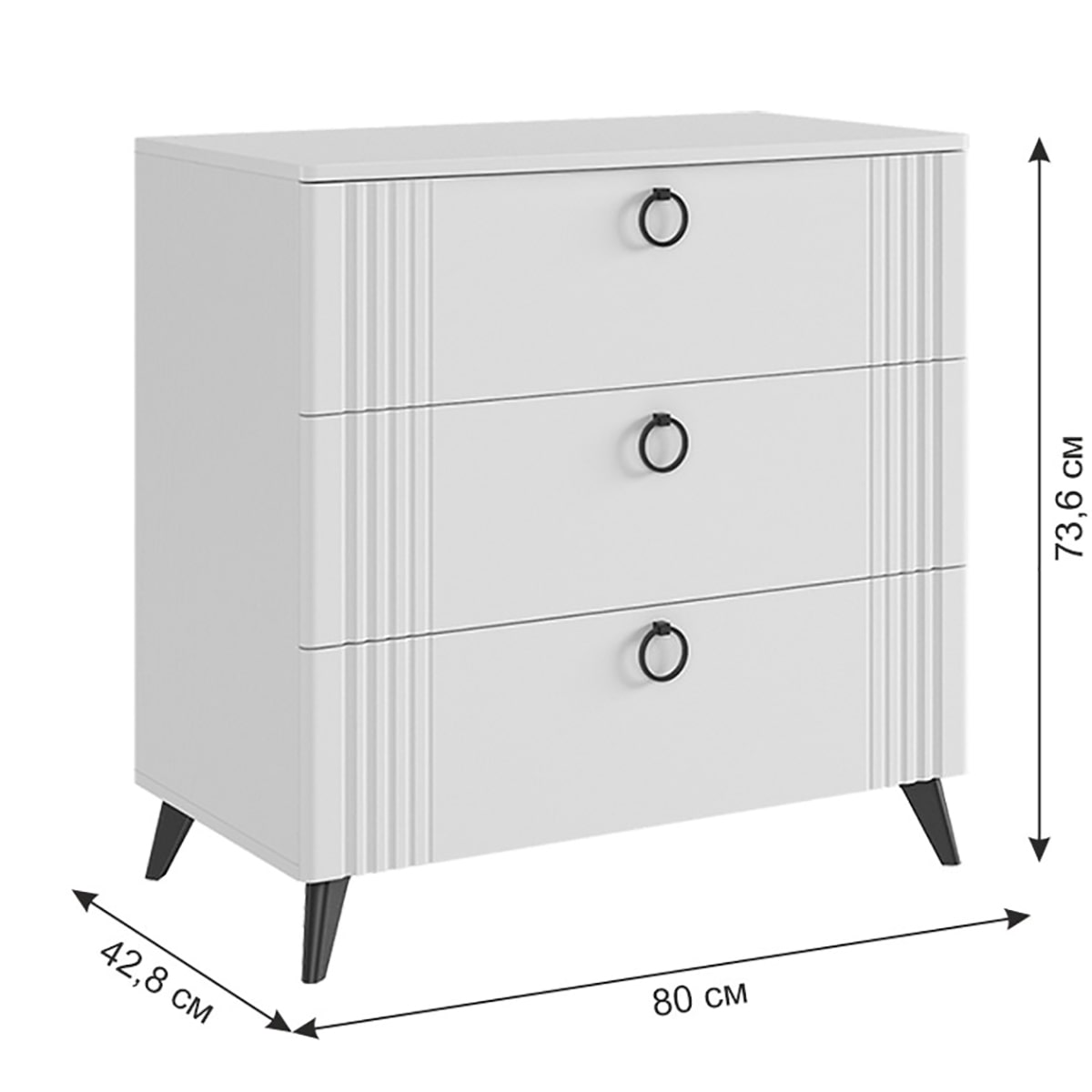 Комод "Ева" идеально сочетает в себе стиль и функциональность. С его размерами 800х428х736 мм он будет отличным дополнением к любому интерьеру. Корпус комода выполнен из ЛДСП в белом деревянном цвете, а фасады - из МДФ, облицованного пленкой ПВХ белого матового цвета. Смело можно сказать, что комод выглядит элегантно. Он оснащен тремя просторными ящиками на шариковых направляющих, что обеспечивает плавное и бесшумное скольжение. Удобные ручки-кнопки добавляют комоду элегантности и обеспечивают удобство использования. Также комод имеет бесшумную систему закрытия фасадов, что делает его идеальным выбором для спален или детских комнат. Пластиковые черные опоры высотой 120 мм придают комоду устойчивсть и добавляют удобство уборки.