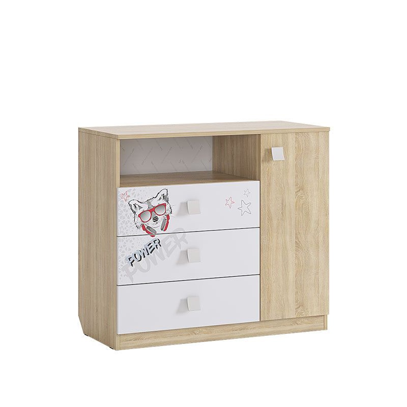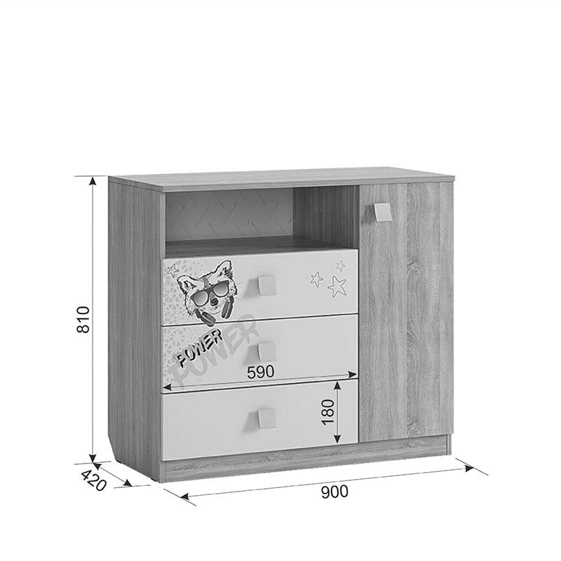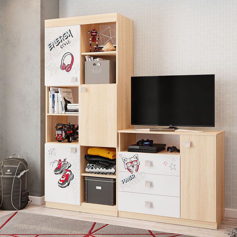 Комод Энерджи предоставляет удобное хранение для детских вещей, игровых приставок и даже телевизора. С открытыми и закрытыми полками, а также ящиками, он обеспечивает легкий доступ ко всему содержимому. Вырез под плинтус делает модель еще более практичной.