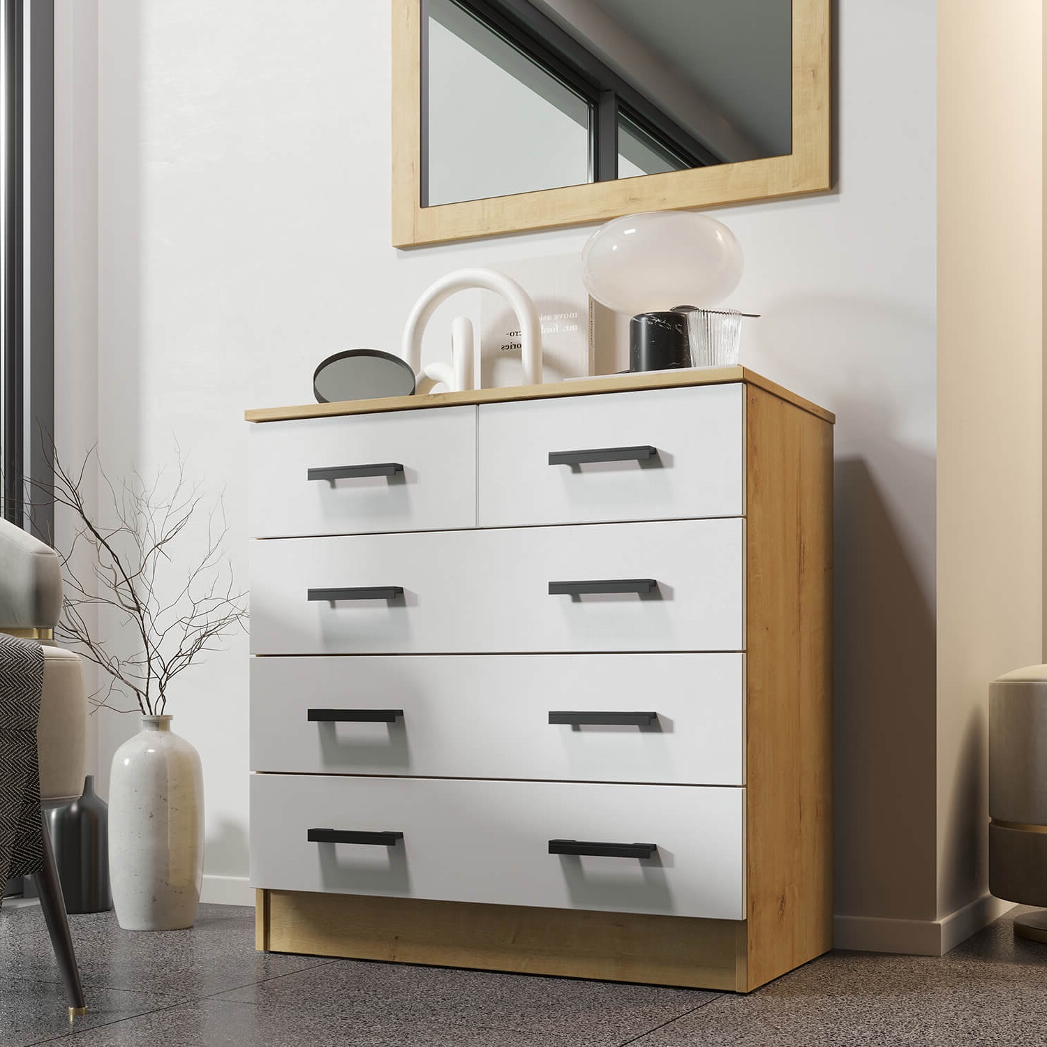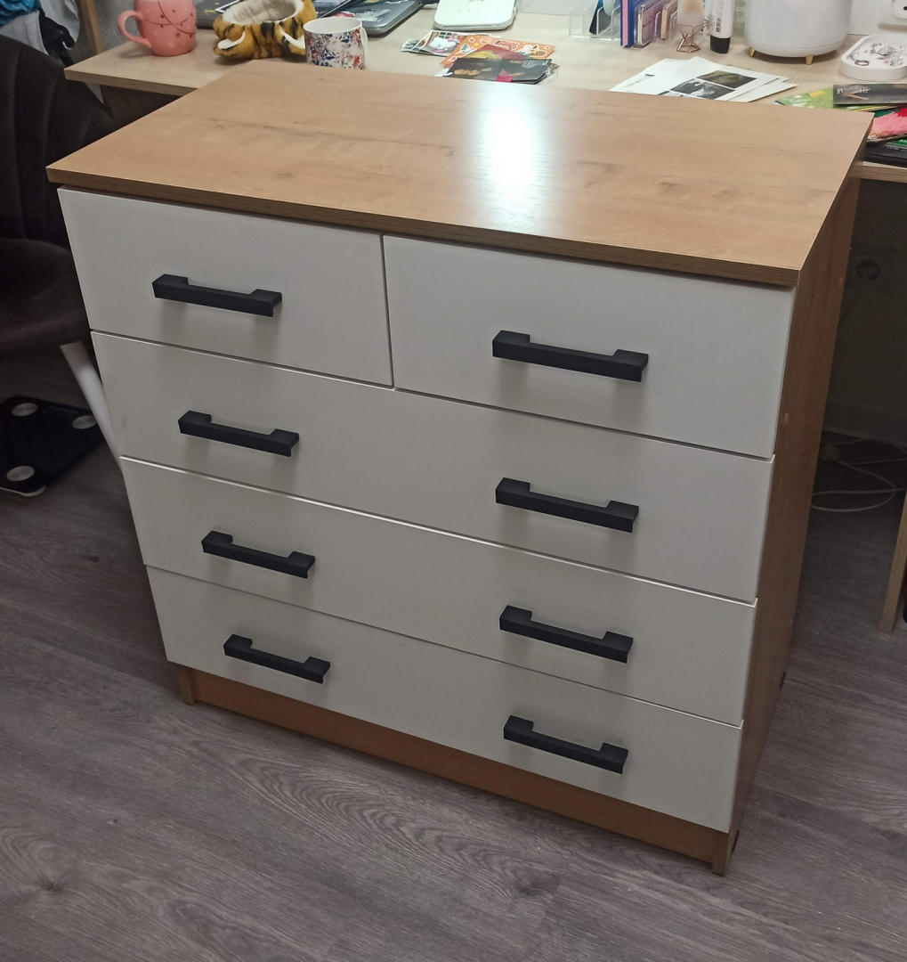 Комод оснащен пятью ящиками с роликовыми направляющими, которые обеспечивают плавное и бесшумное открывание.