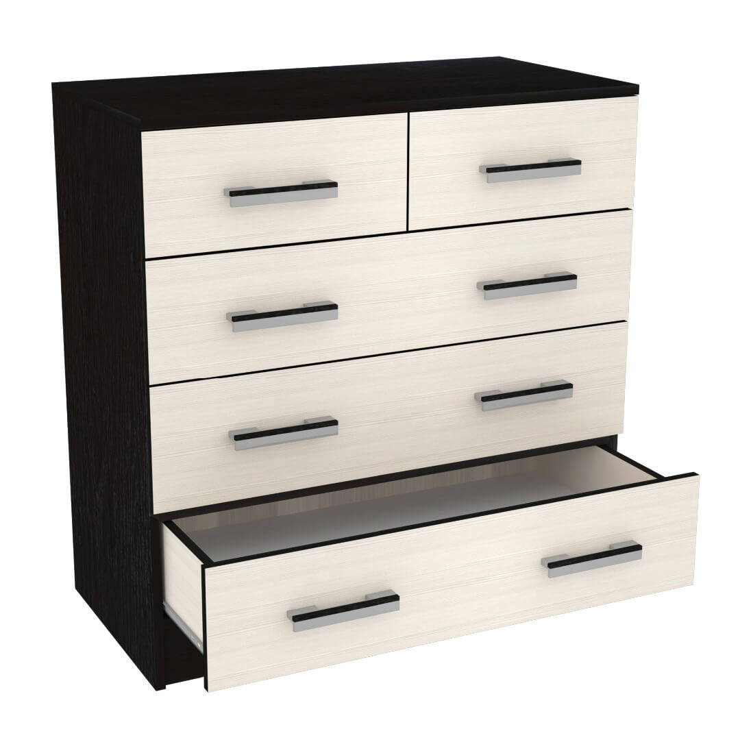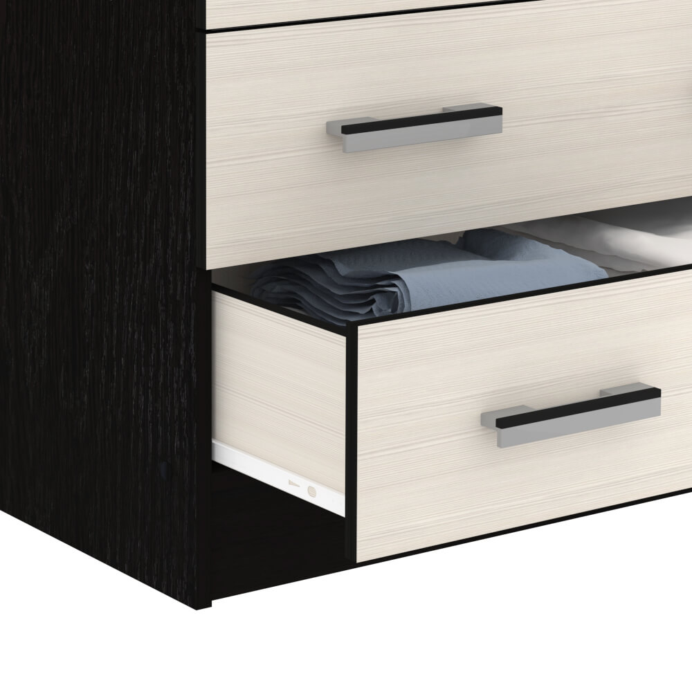 Комод оснащен пятью ящиками с роликовыми направляющими, что обеспечивает плавное и бесшумное открывание и закрывание.