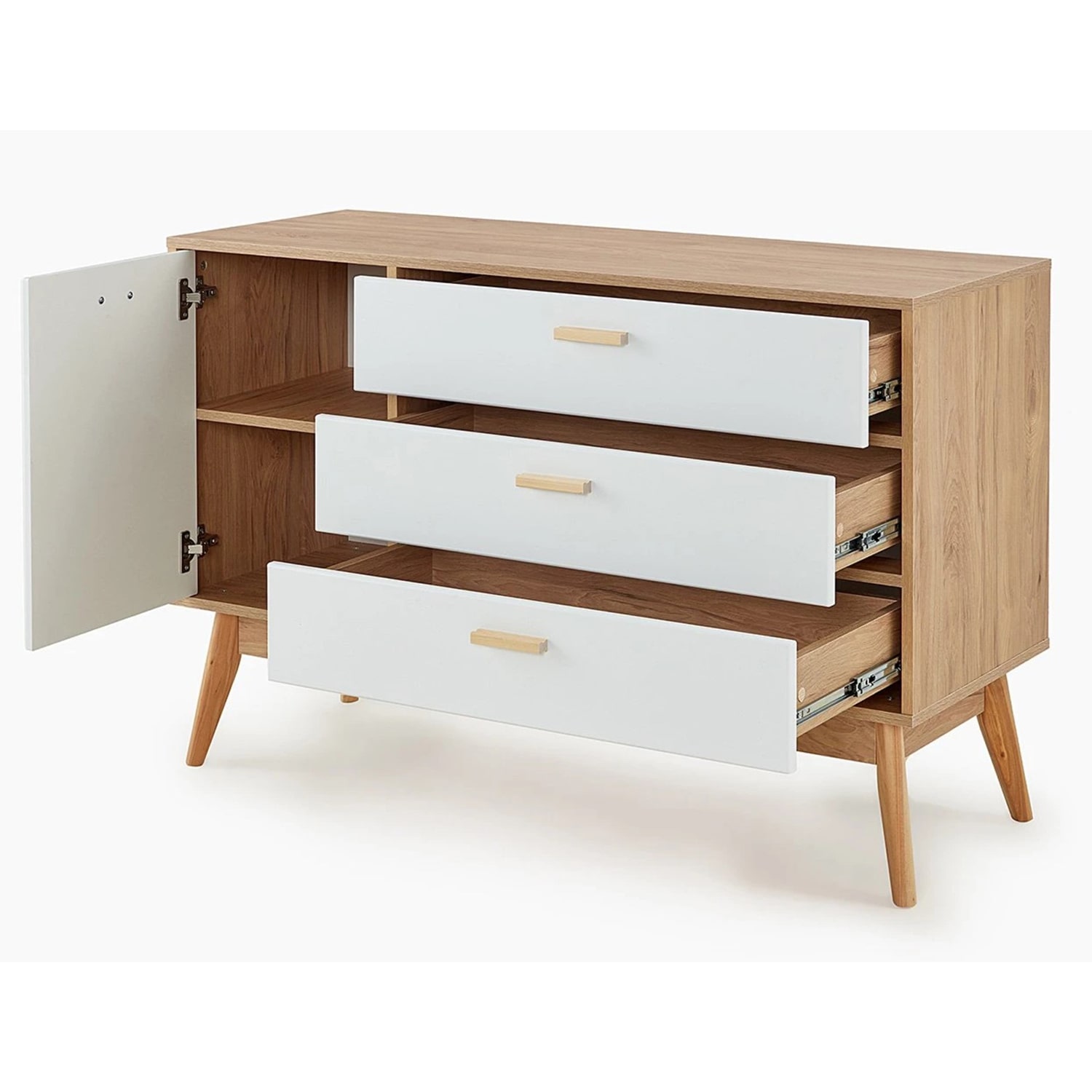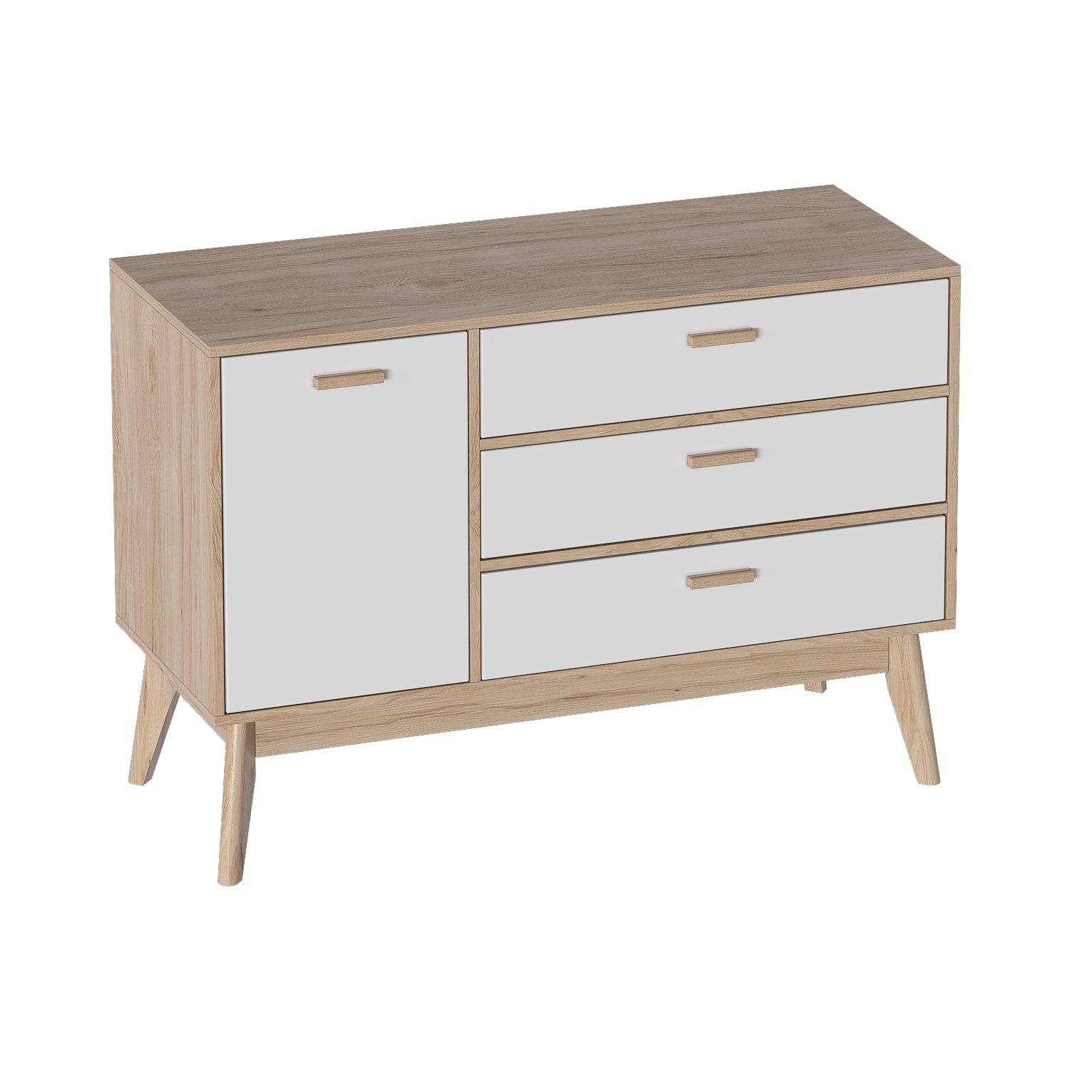 Привлекающий внимание легкостью и комфортом в использовании, комод "Калгари" не только украсит Ваш любимый скандинавский интерьер, но и порадует своей функциональностью. Каркас комода изготовлен из ЛДСП в цвет натурального дуба, фасады ящиков – из МДФ белого матового цвета, стильные и устойчивые ножки - из массива березы.