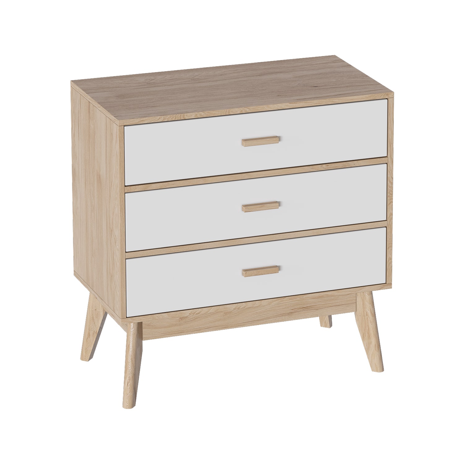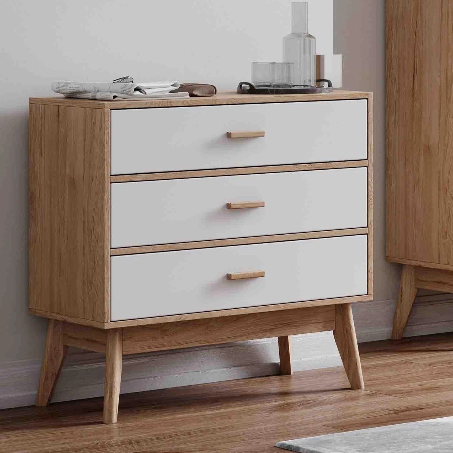 Привлекающий внимание легкостью и комфортом в использовании, комод "Калгари" не только украсит Ваш любимый скандинавский интерьер, но и порадует своей функциональностью. Каркас комода изготовлен из ЛДСП в цвет натурального дуба, фасады ящиков – из МДФ белого матового цвета, стильные и устойчивые ножки - из массива березы.
