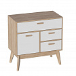 Небольшие размеры позволяют разместить этот интерьерный предмет как в компактной прихожей, так и в любом другом помещении. Корпус комода выполнен из ЛДСП цвета натурального дуба, фасады - из белоснежного матового МДФ. Высокие опоры из массива березы облегчают уборку и делают комод легким в интерьере. Ручки выполнены из массива березы.