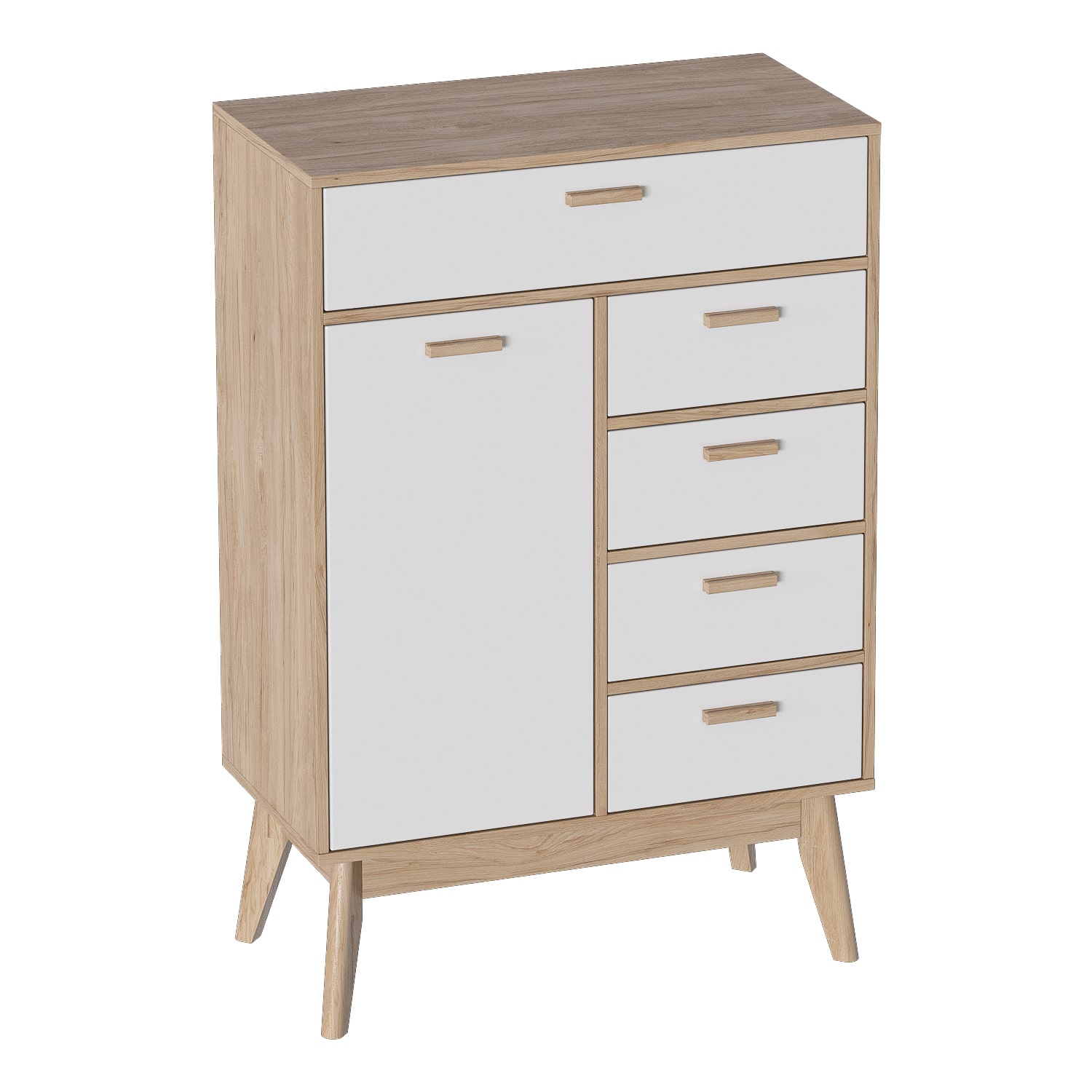 Ящики выдвигаются полностью, что облегчает доступ ко всему их содержимому. Дизайн расставленных под углом стильных опор из массива березы вдохновлен лучшими образцами стиля mid-century modern. Белоснежные фасады из МДФ нарядно смотрятся на фоне корпуса из ЛДСП цвета натурального дуба. Ручки выполнены из массива березы.