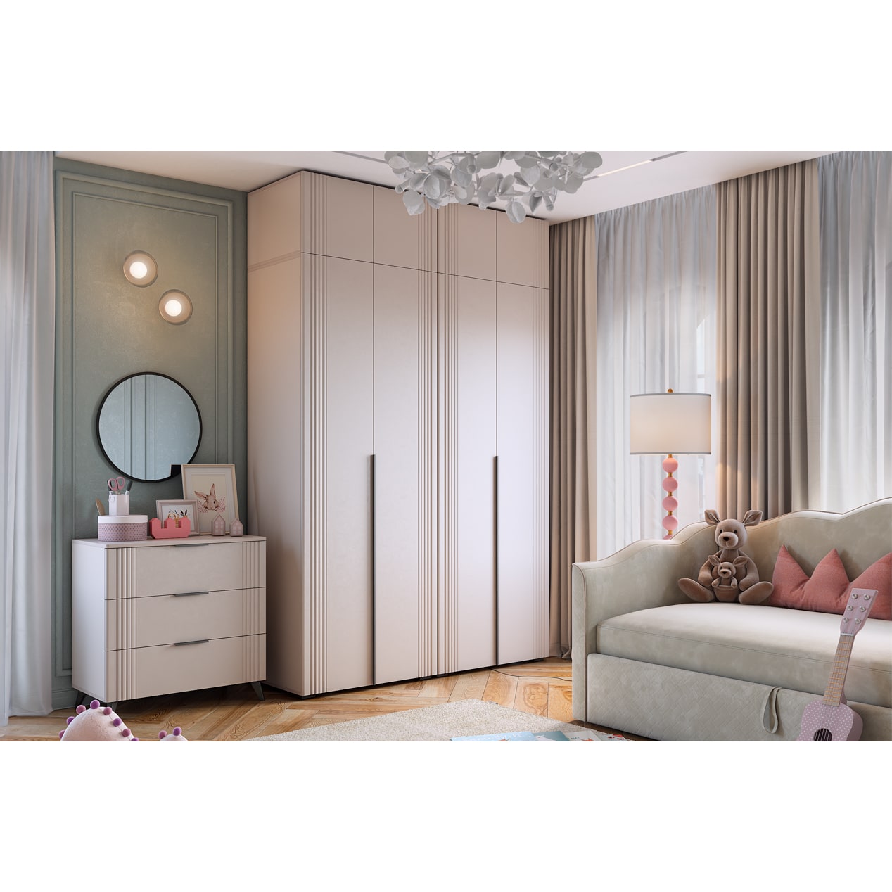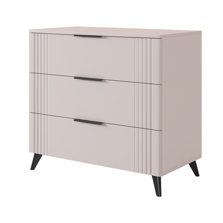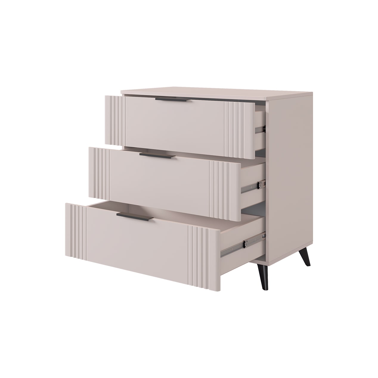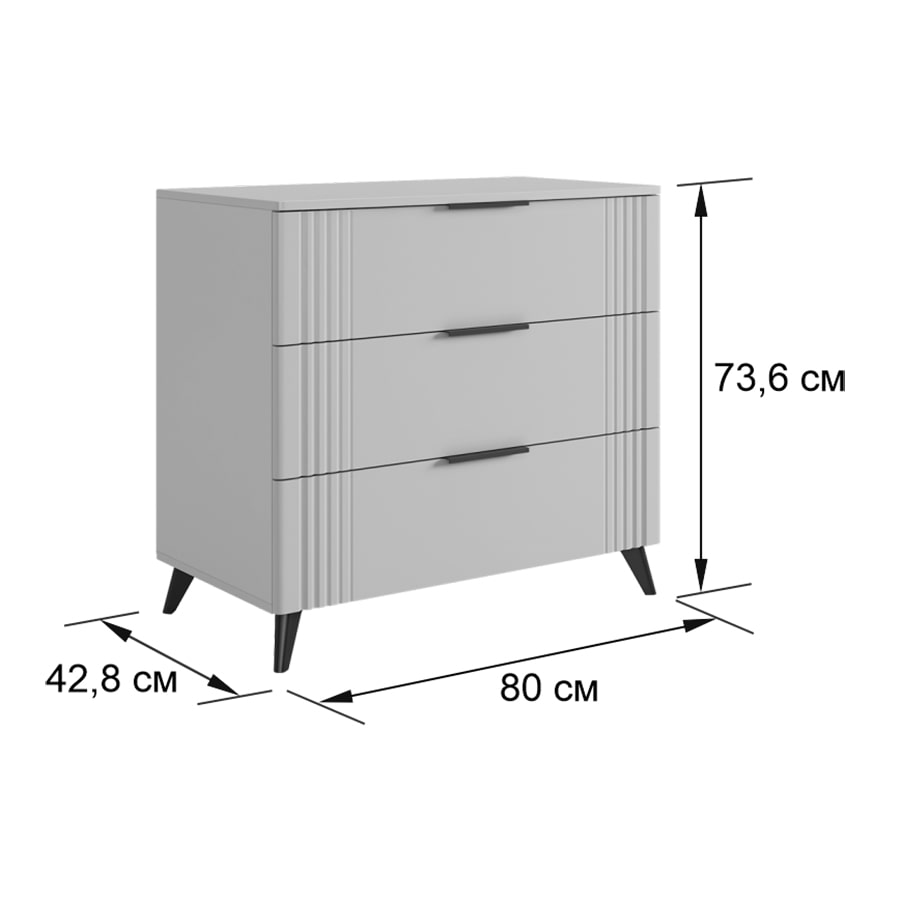 Комод изготовлен из качественных материалов: корпус выполнен из ЛДСП, что гарантирует прочность и долговечность, а фасад, выполненный из МДФ в плёнке ПВХ, не только выглядит эстетично, но и защищает комод от повреждений. Особое внимание заслуживает фрезеровка фасадов, которая придаёт изделию изысканный вид.