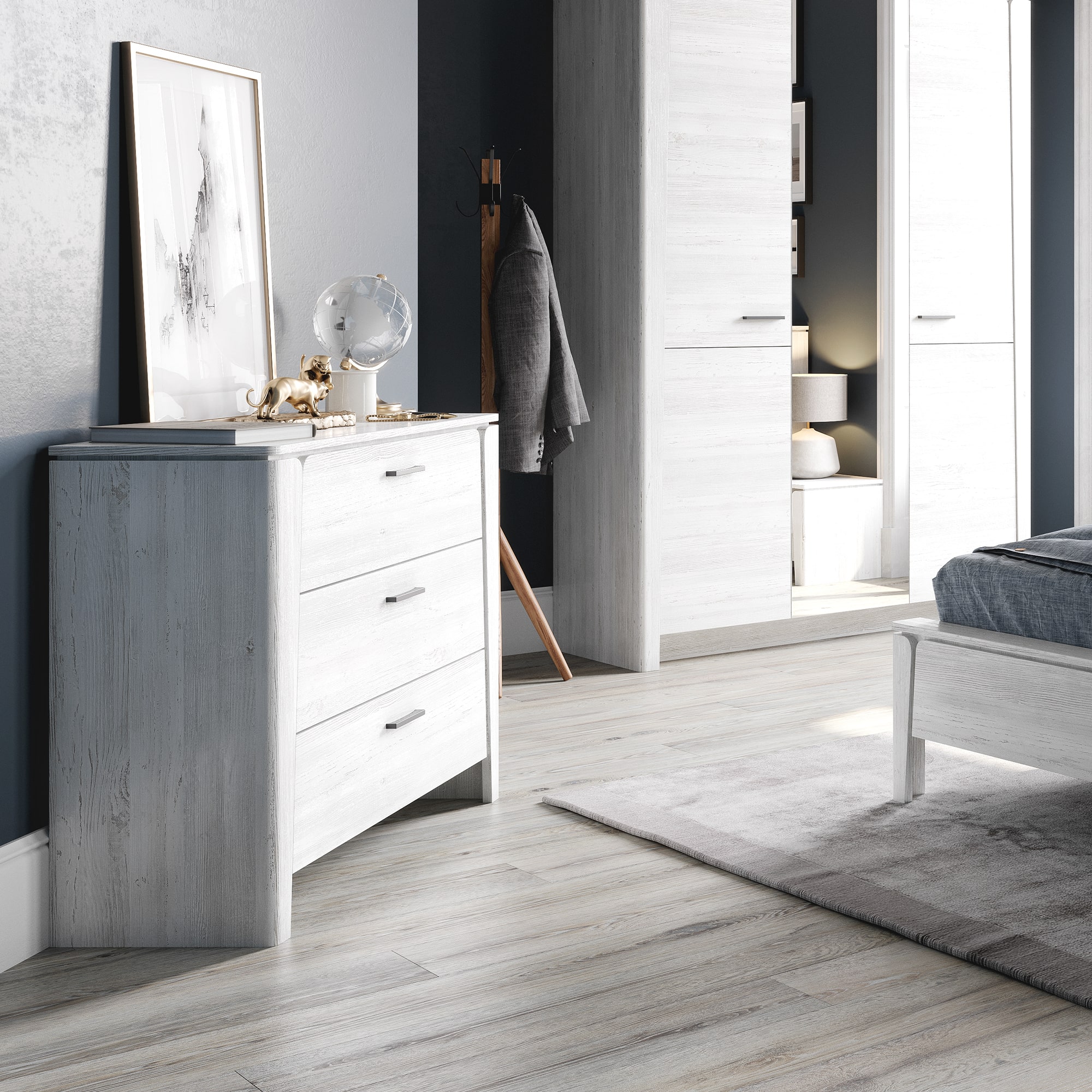 Вместительность комода обеспечивает три выдвижных ящика, которые идеально подходят для хранения одежды, постельного белья и других личных вещей. Каждый ящик оборудован шариковыми направляющими, обеспечивающими плавный и бесшумный ход при использовании. Благодаря этому, вы сможете быстро и без лишних усилий найти нужную вещь и так же легко вернуть ящик на место.