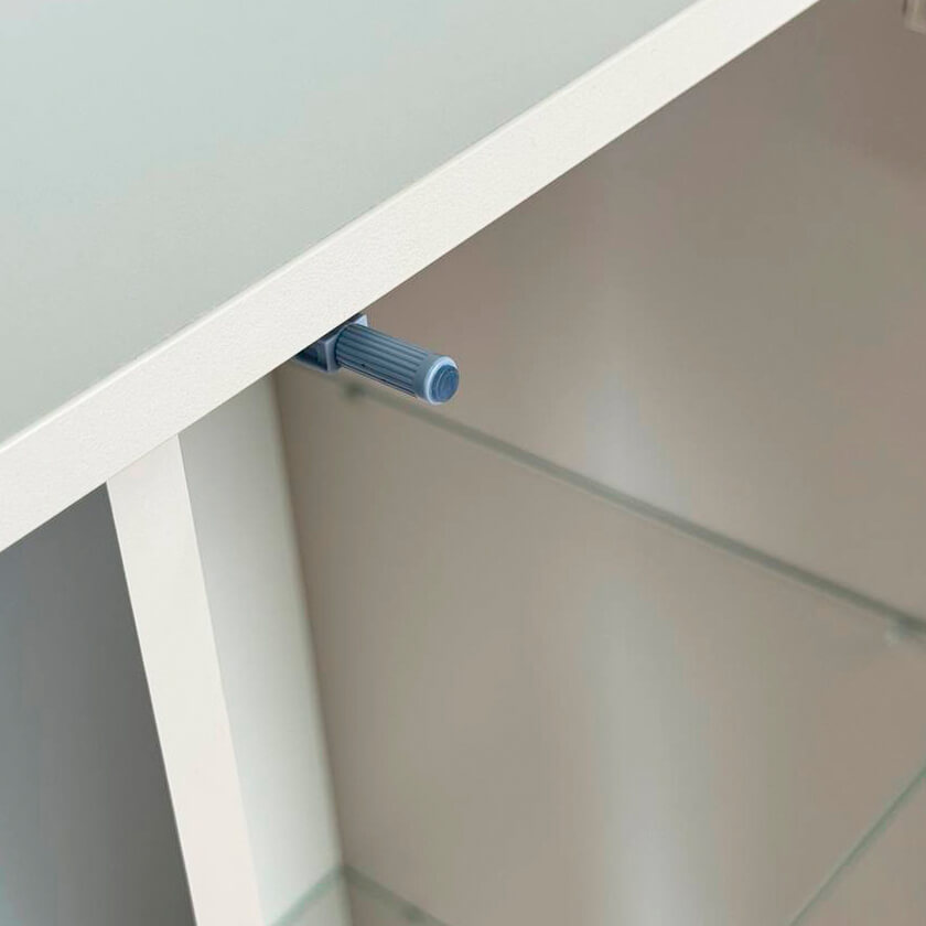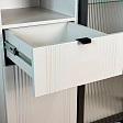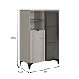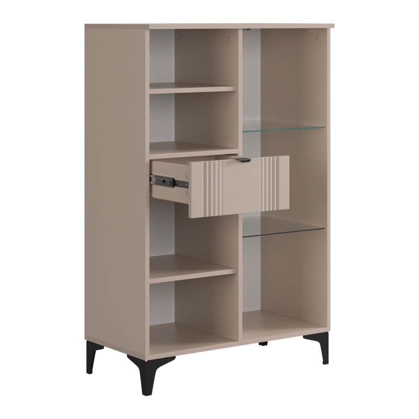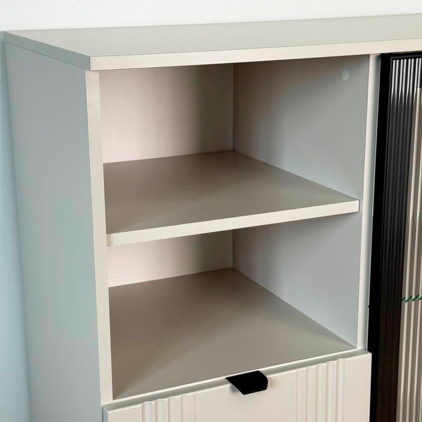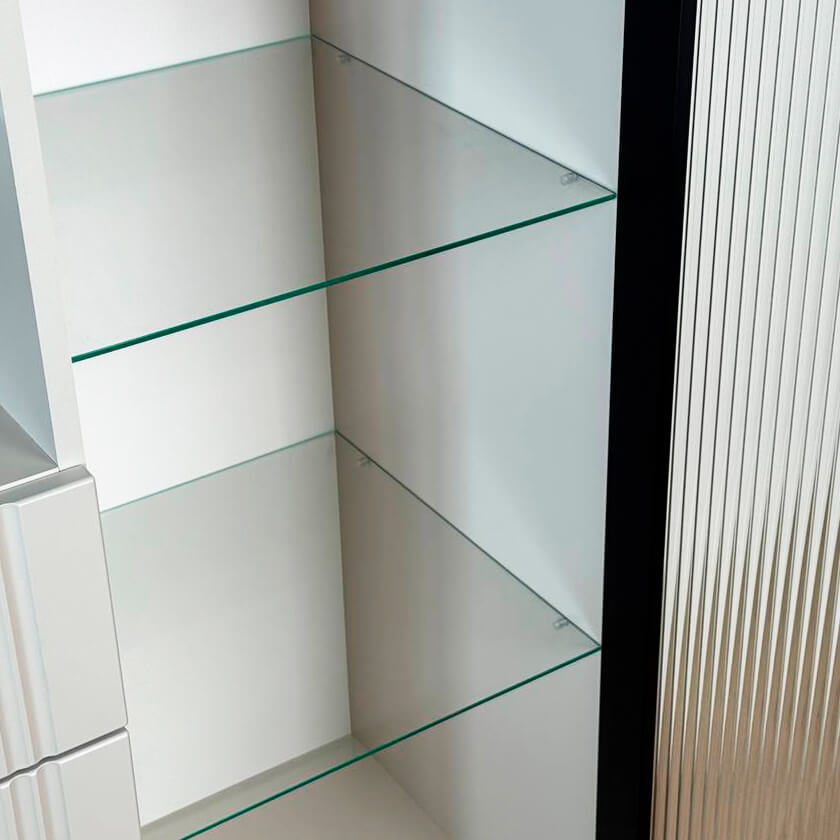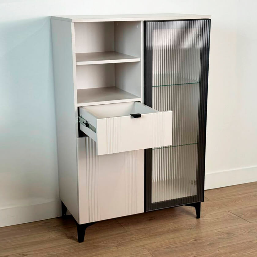 Дизайн комода продуман до мелочей: с одной стороны расположена стеклянная дверца, за которой находится просторное пространство для хранения. С другой стороны – ниша с открытой полкой, выкатной ящик и ещё одна глухая дверца, что позволяет гибко организовать хранение и поддерживать порядок в доме.