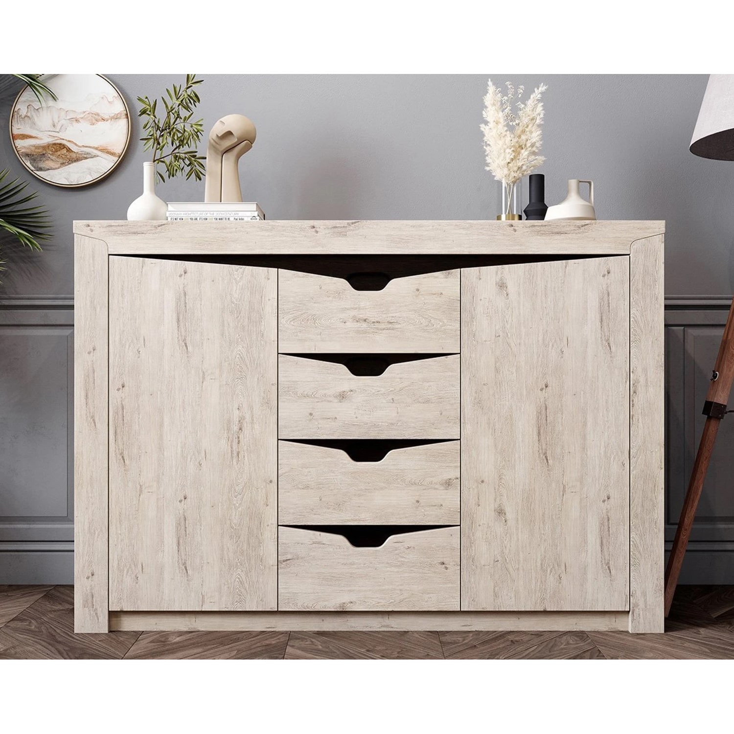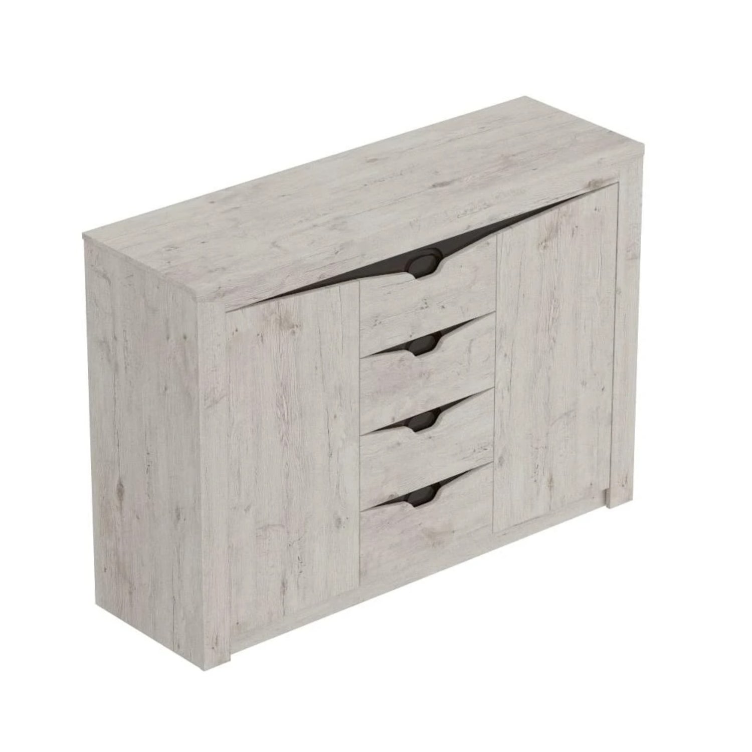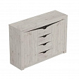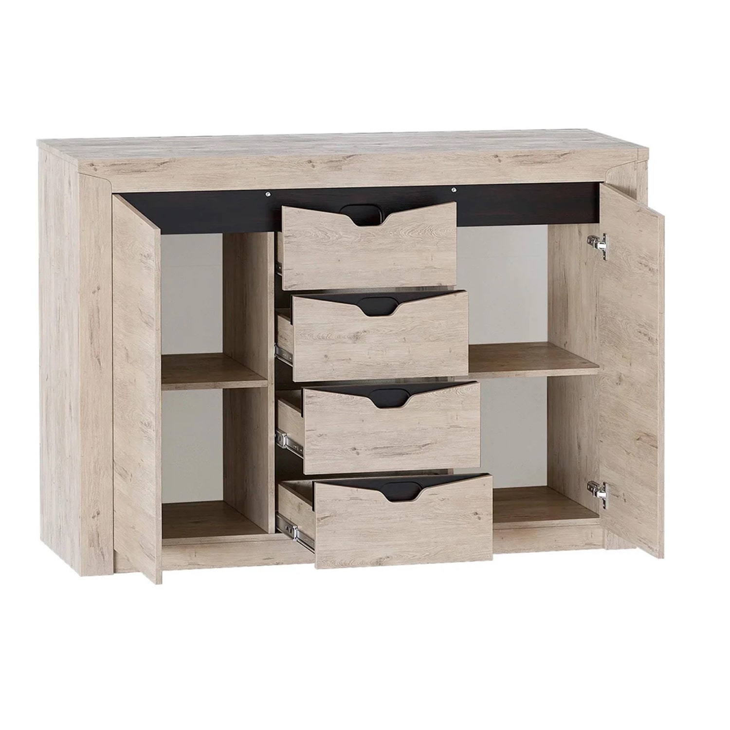 Комод "Соренто" имеет четыре выдвижных ящика, а также два вместительных отделения по бокам с полками и распашными дверями. На фасаде имеются декоративные вырезы, выполняющие функцию ручек.