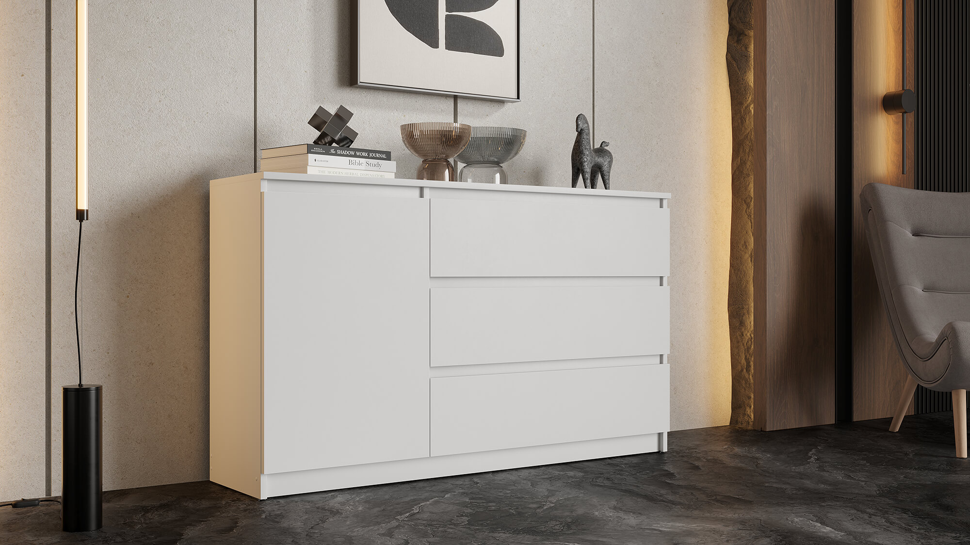 Комод «Вега» — стильное и практичное решение для организации пространства в вашем доме. Модель сочетает современный дизайн с продуманной функциональностью: вместительные ящики и отделение за дверцей позволяют аккуратно хранить одежду, постельное бельё или бытовые мелочи.