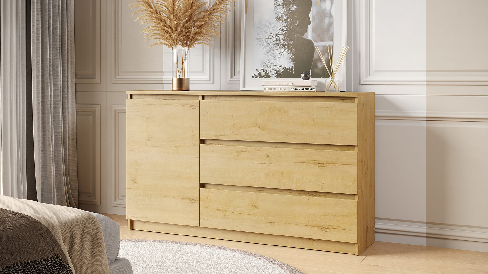 Комод «Вега» — стильное и практичное решение для организации пространства в вашем доме. Модель сочетает современный дизайн с продуманной функциональностью: вместительные ящики и отделение за дверцей позволяют аккуратно хранить одежду, постельное бельё или бытовые мелочи.