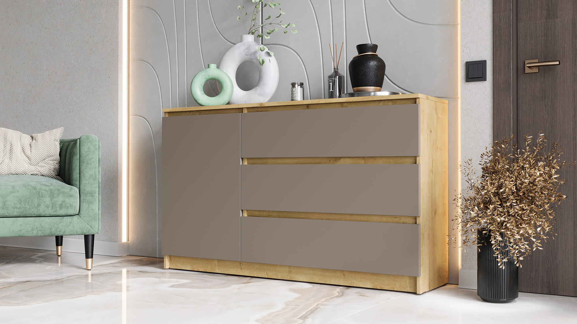 Комод «Вега» — стильное и практичное решение для организации пространства в вашем доме. Модель сочетает современный дизайн с продуманной функциональностью: вместительные ящики и отделение за дверцей позволяют аккуратно хранить одежду, постельное бельё или бытовые мелочи.