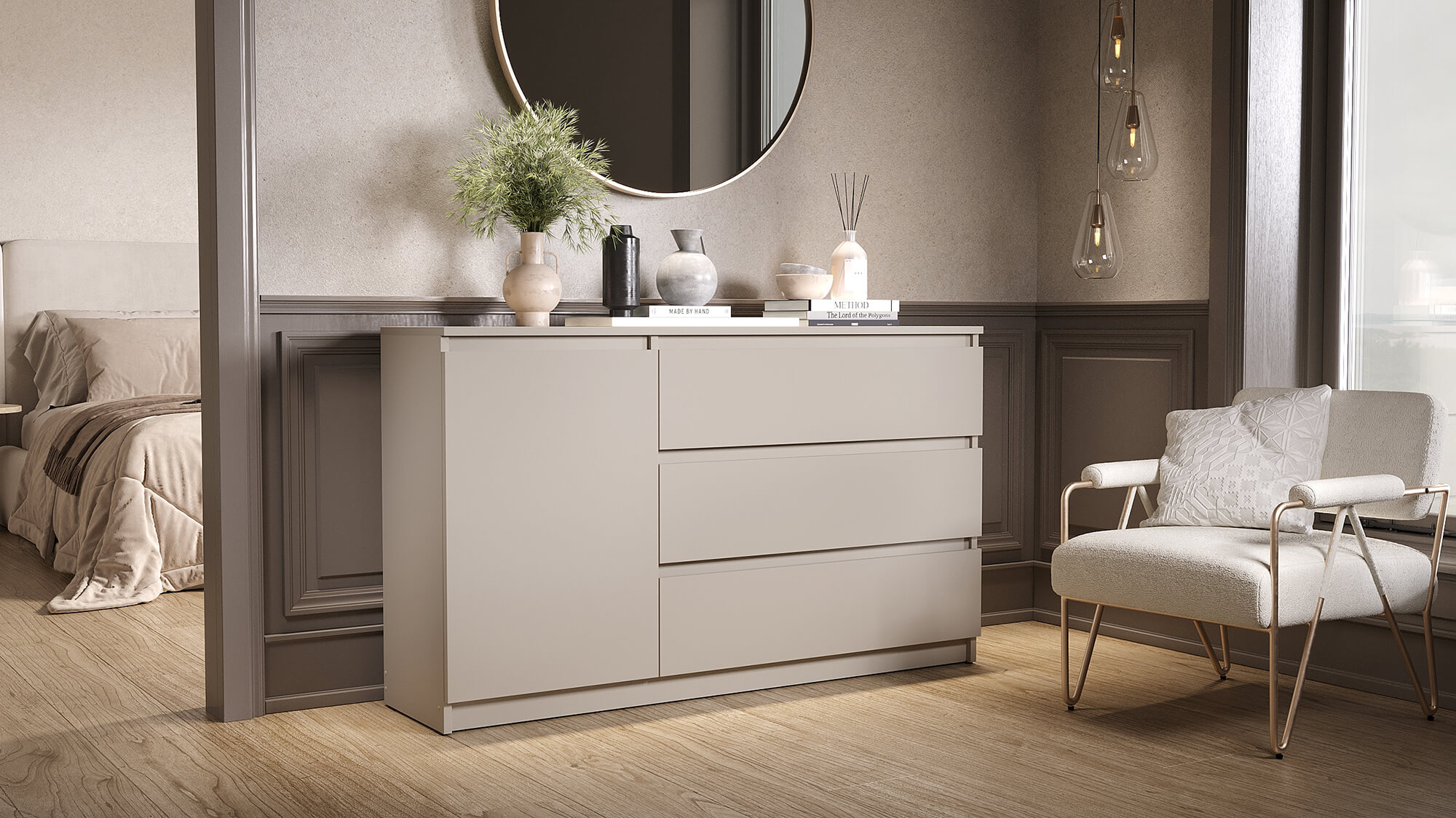 Комод «Вега» — стильное и практичное решение для организации пространства в вашем доме. Модель сочетает современный дизайн с продуманной функциональностью: вместительные ящики и отделение за дверцей позволяют аккуратно хранить одежду, постельное бельё или бытовые мелочи.