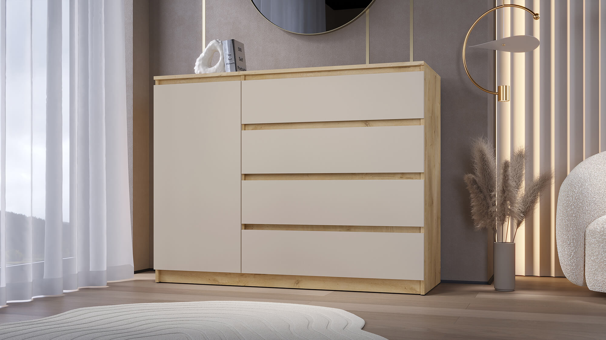 Комод «Вега» — стильное и практичное решение для организации пространства в вашем доме. Модель сочетает современный дизайн с продуманной функциональностью: вместительные ящики и отделение за дверцей позволяют аккуратно хранить одежду, постельное бельё или бытовые мелочи.