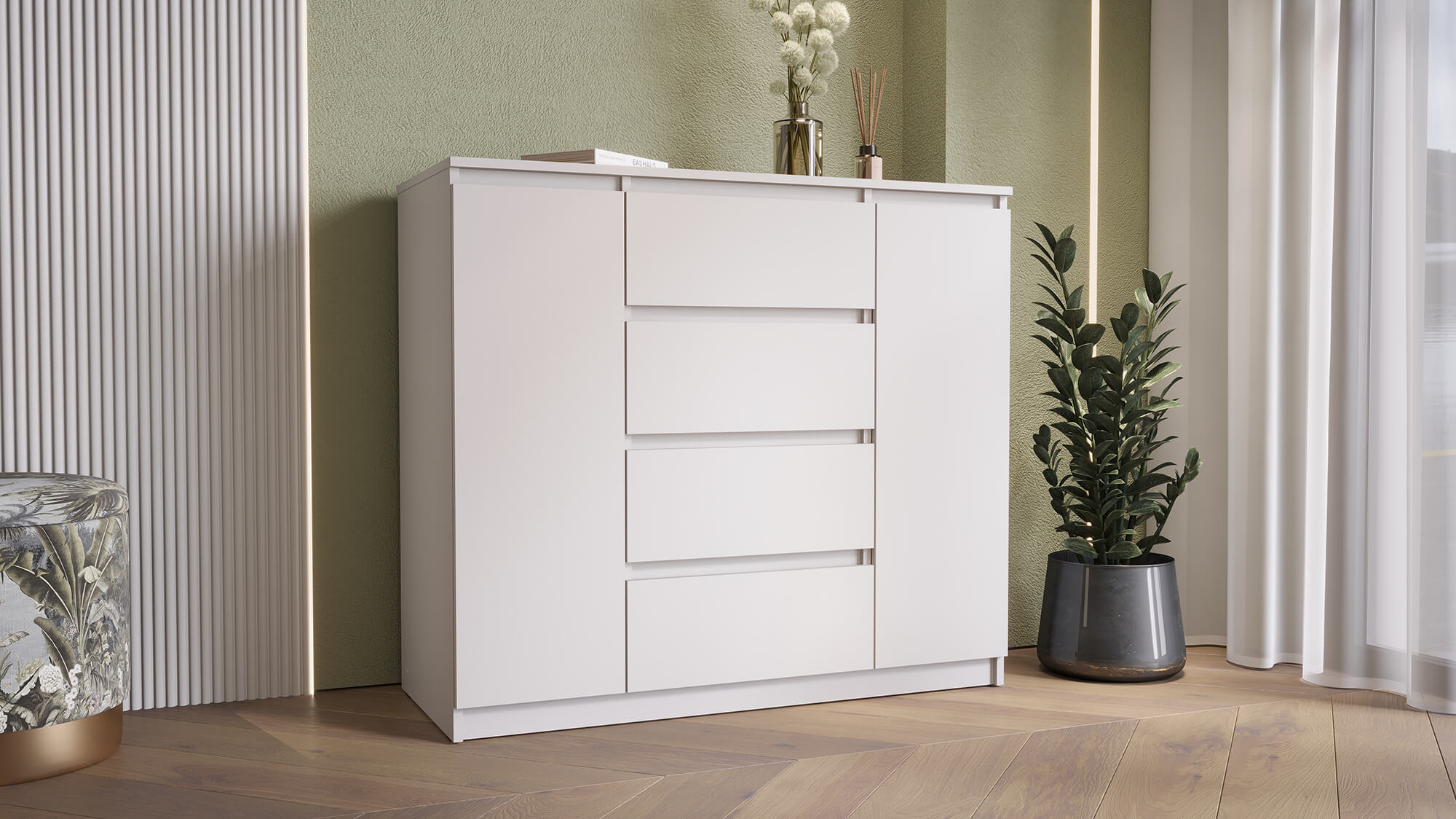 Комод «Вега» — стильное и практичное решение для организации пространства в вашем доме. Модель сочетает современный дизайн с продуманной функциональностью: вместительные ящики и отделение за дверцей позволяют аккуратно хранить одежду, постельное бельё или бытовые мелочи.
