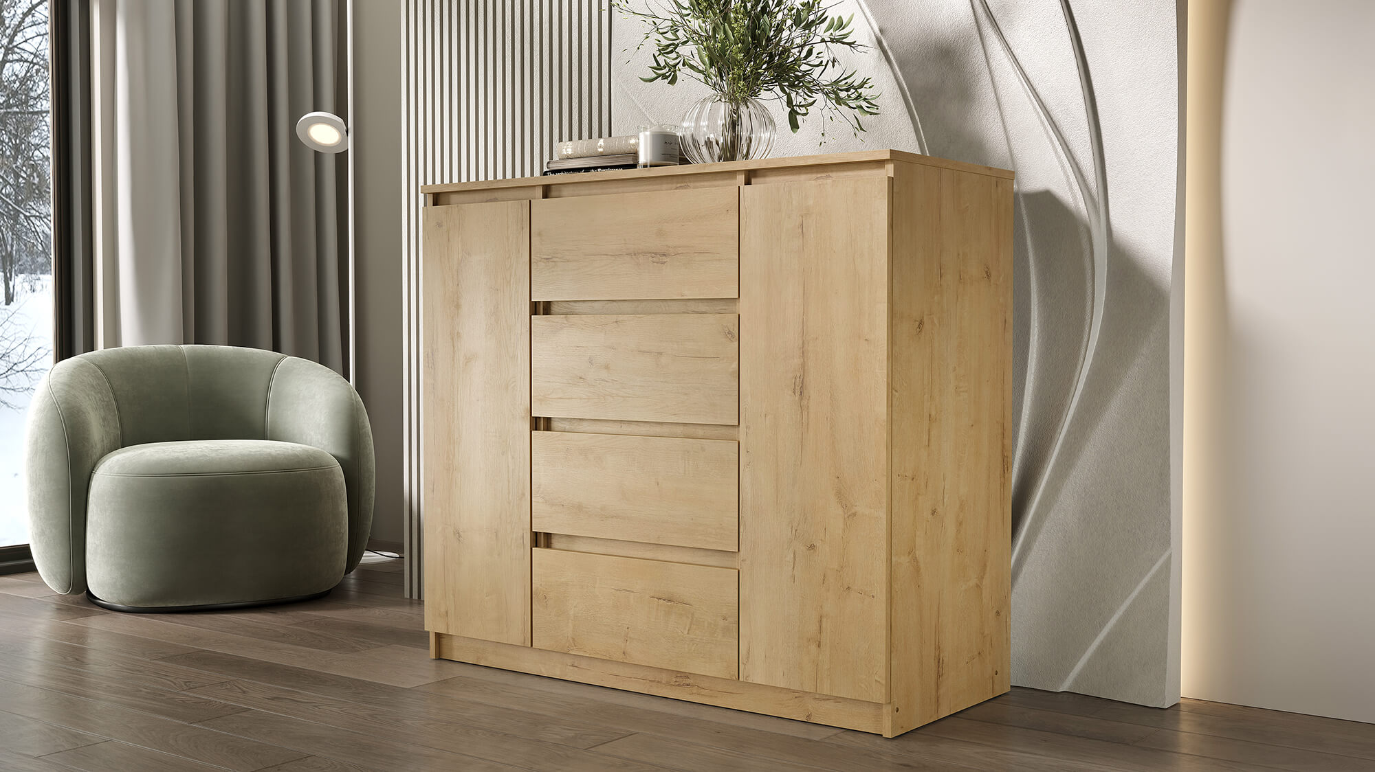 Комод «Вега» — стильное и практичное решение для организации пространства в вашем доме. Модель сочетает современный дизайн с продуманной функциональностью: вместительные ящики и отделение за дверцей позволяют аккуратно хранить одежду, постельное бельё или бытовые мелочи.