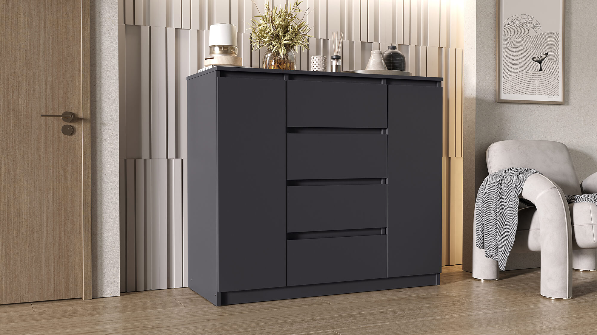 Благодаря лаконичному внешнему виду комод органично впишется в интерьер спальни, гостиной или прихожей. Прочные материалы и надёжная фурнитура гарантируют долгий срок службы, а чёткие линии и стильная цветовая гамма подчеркнут эстетику вашего дома.