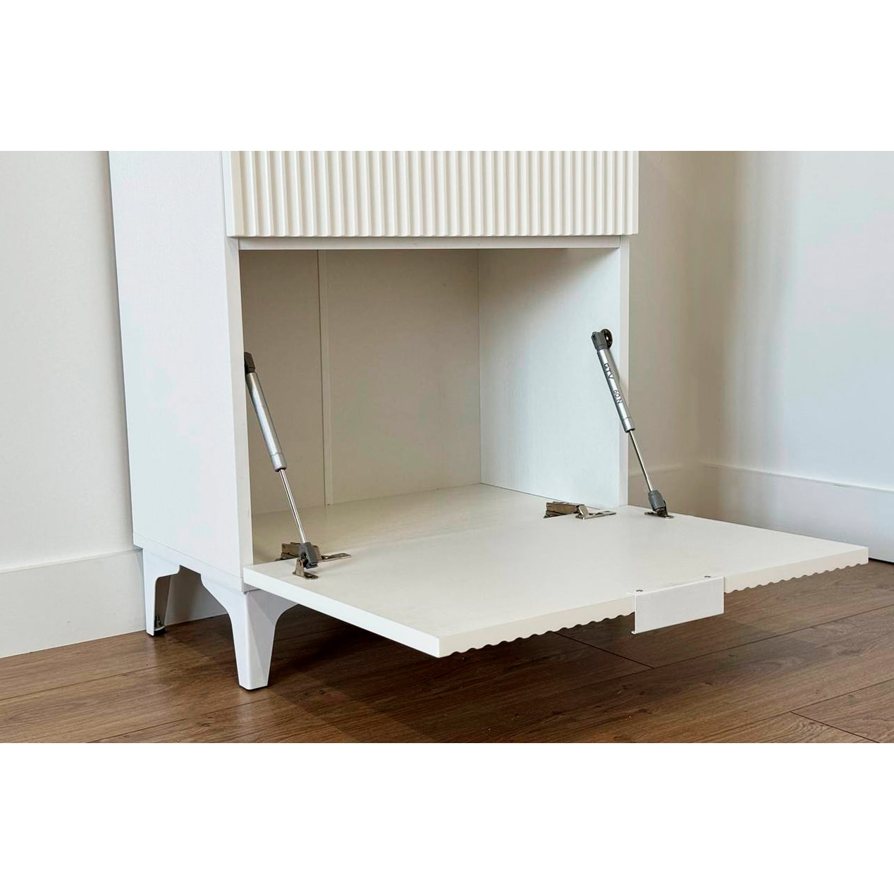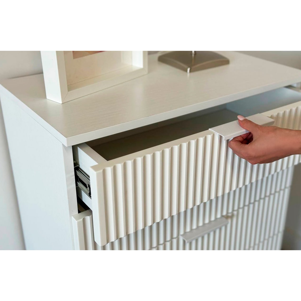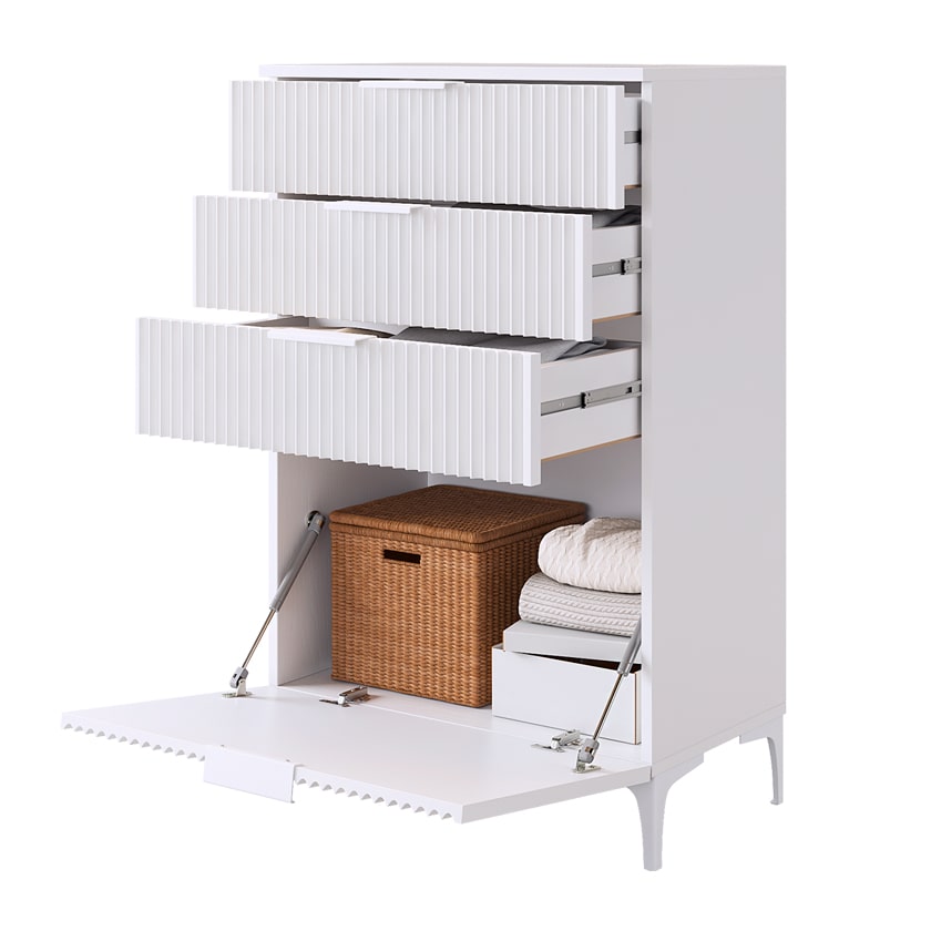 Комод «Зефир» — идеальное решение для детской и гостиной комнат. Он оснащён выкатными ящиками и откидной секцией, обеспечивая максимальный комфорт и удобство использования. Фасады украшены изящной фрезеровкой, которая придаёт изделию неповторимый шарм и элегантность.