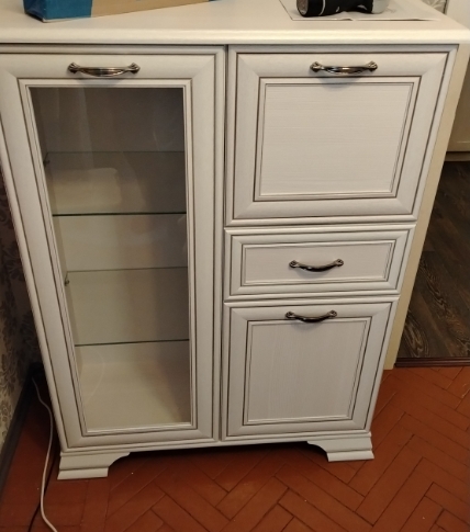 Тумба Тиффани 1V2D1S, такой элемент подходит для оформления интерьера в классическом стиле гостиной, столовой, кабинета. Тумба 1V2D1S – прямая. Конструкция элемента представляет собой две вместительные ниши с откидной дверью и распашной (2D – двери глухие), одно отделение с полками из закалённого стекла за витриной (1V – закалённое стекло) для хранения посуды, предметов декора и других вещей; и один выдвижной ящик (1S) для хранения предметов быта, салфеток.