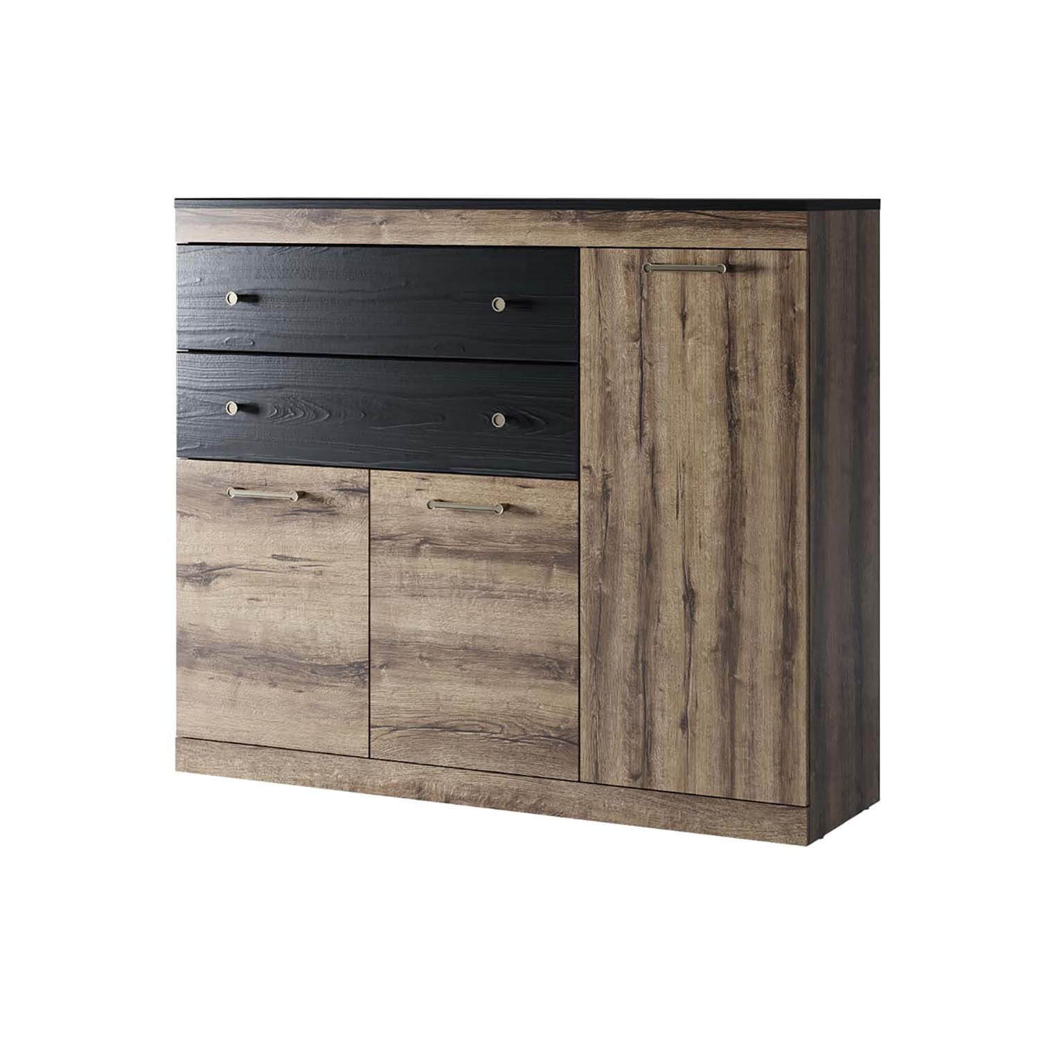 Тумба 3D2S JAGGER – прекрасное дополнение в интерьере спальни и гостиной. Выступает не только как оригинальная часть гарнитура, но и как самостоятельный предмет мебели. Тумба 3D2S имеет прямую конструкцию. Конструкция элемента представляет одно отделение с полками из ЛДСП за глухой дверью, одно отделение с полкой из ЛДСП за двумя глухими дверями, два выдвижных ящика (2S). Элемент может организовать хранение постельного белья, предметов одежды, полотенец, скатертей и салфеток, посуды и столовых предметов, а также других предметов быта.
