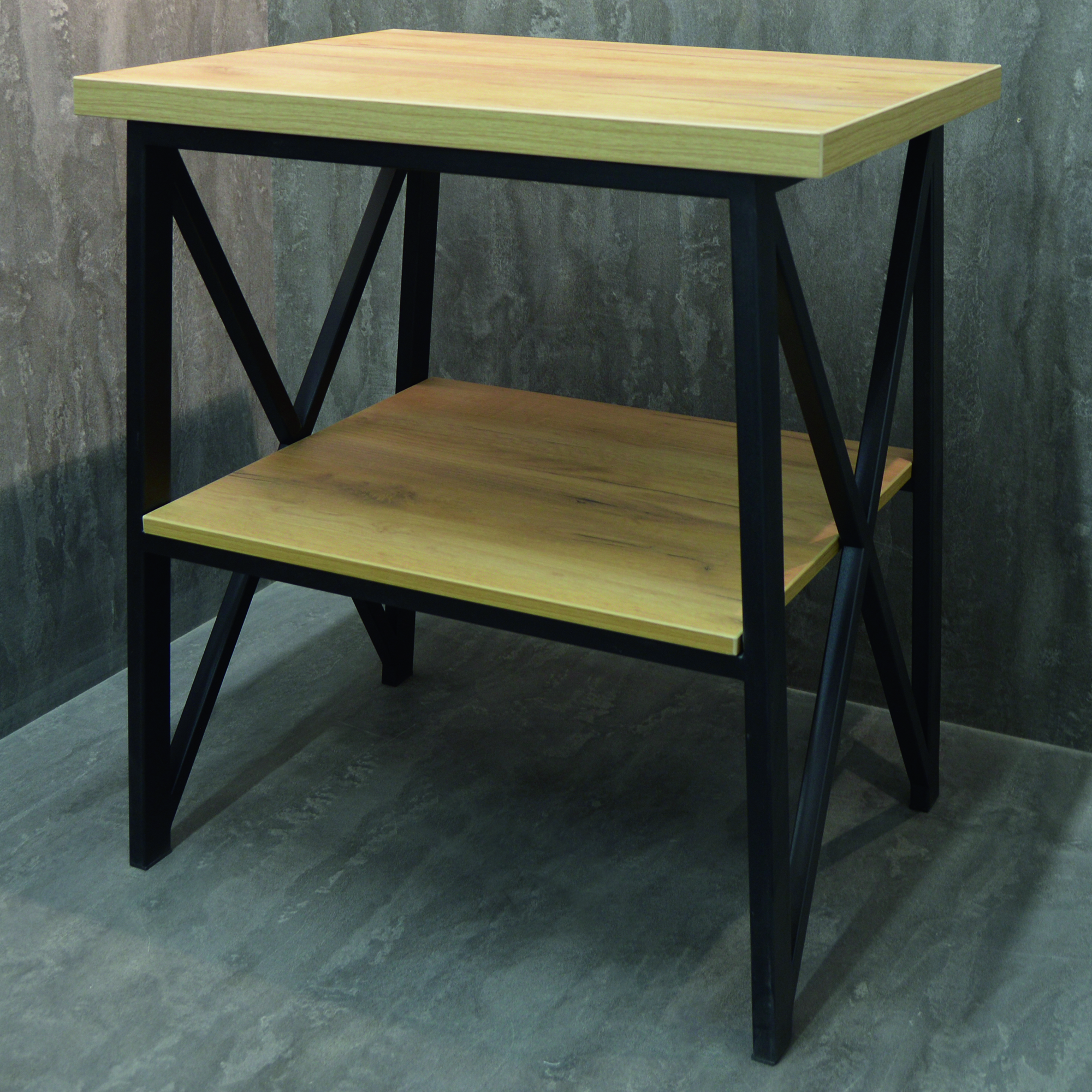 Каркас из трубы 20х40 мм и 20х20 мм, порошковое покрытие черный муар, столешница МДФ 32 мм, полка МДФ 16 мм, пленка ПВХ дуб табачный.