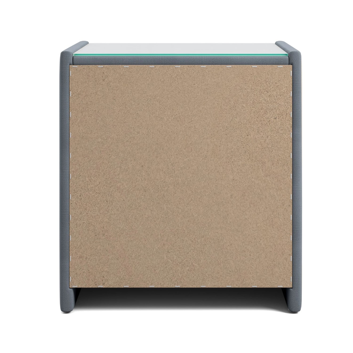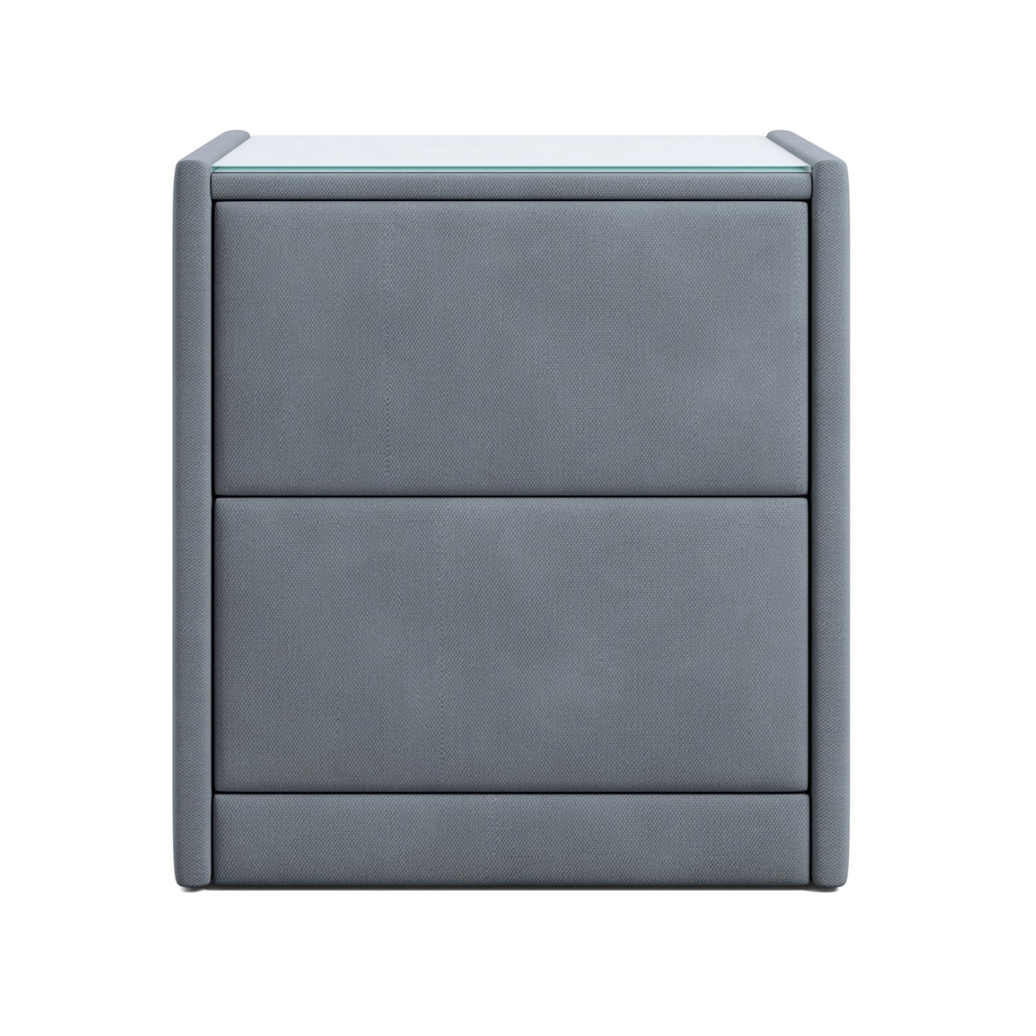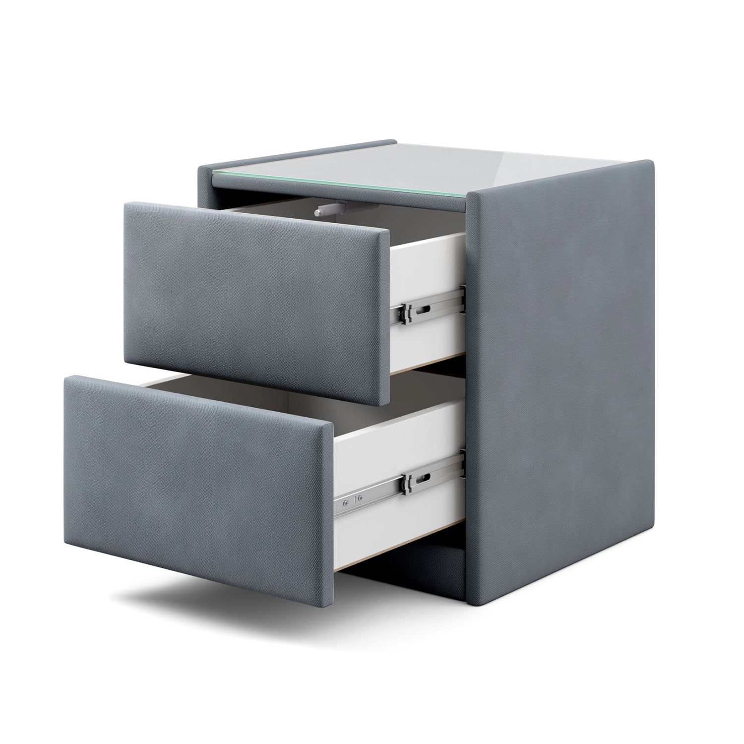 Тумба обтянута высококачественным велюром, что придает ей особый уют и комфорт. Имеет стеклянную столешницу и два вместительных выдвижных ящика с механизмом Push to open. Скругленные торцы модели, минимизируют риск удариться в темноте.