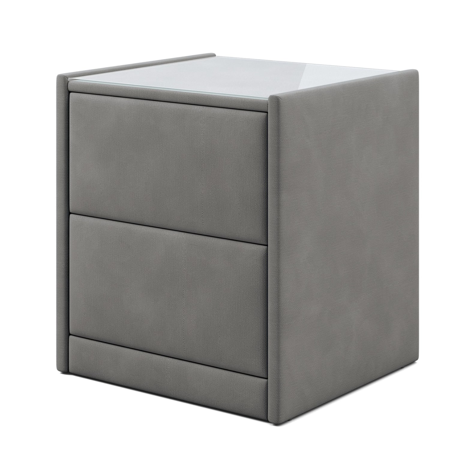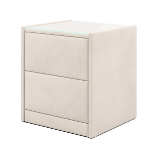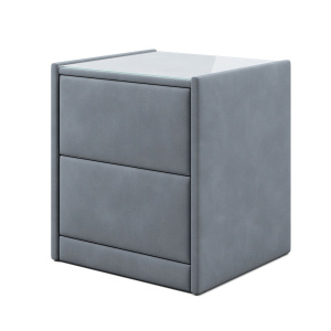 Тумба обтянута высококачественным велюром, что придает ей особый уют и комфорт. Имеет стеклянную столешницу и два вместительных выдвижных ящика с механизмом Push to open. Скругленные торцы модели, минимизируют риск удариться в темноте.