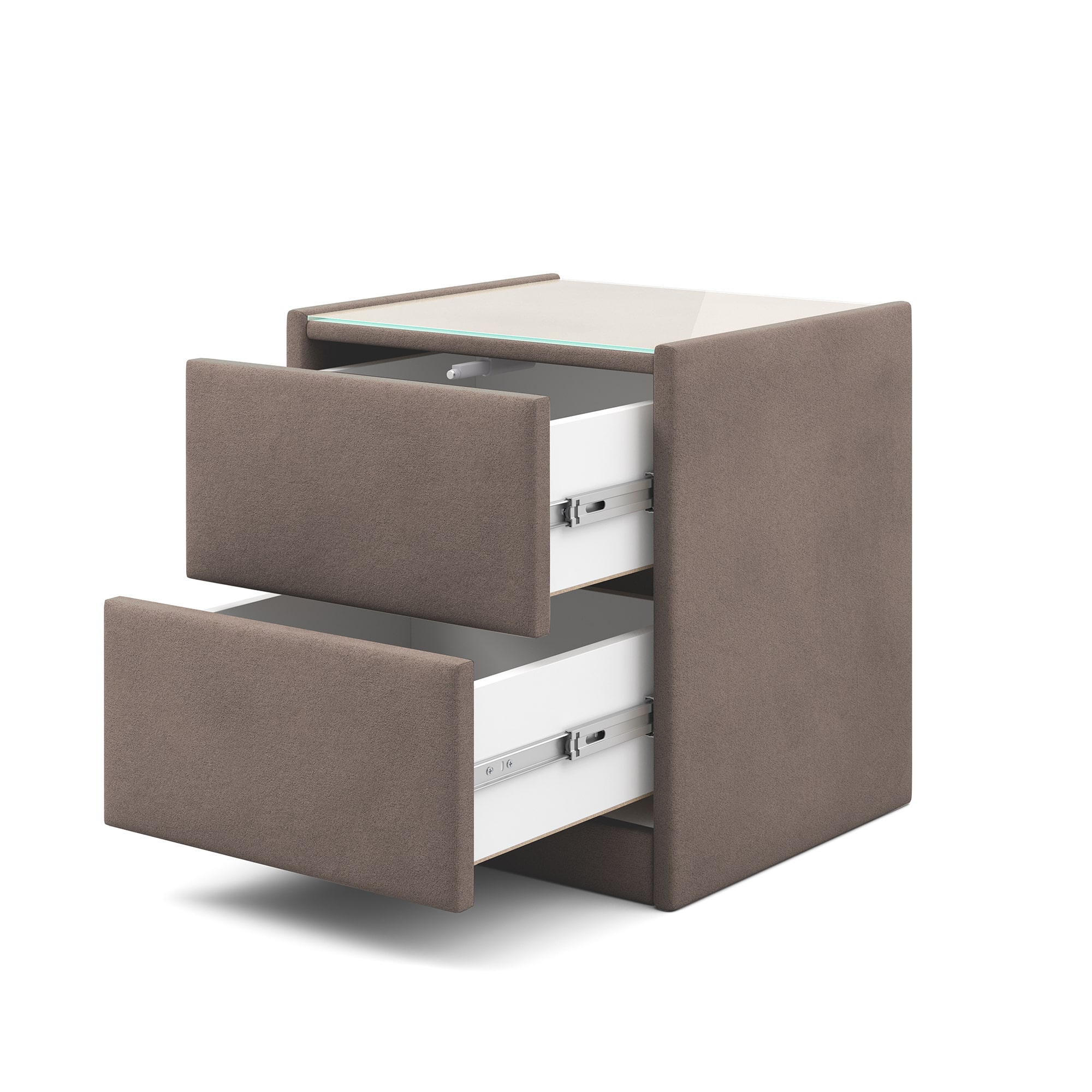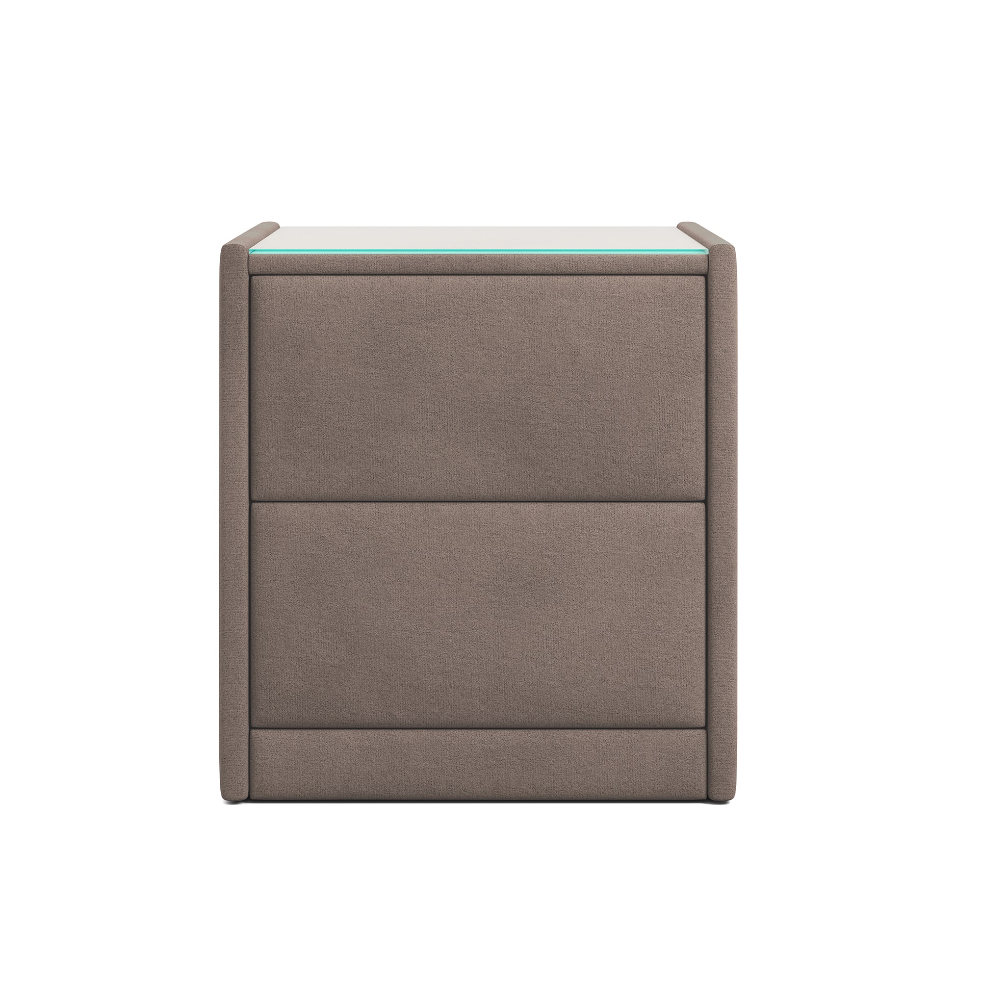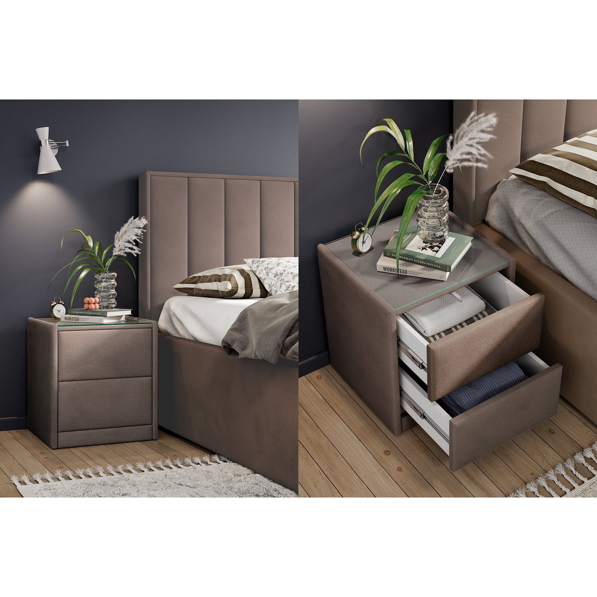 Тумба обтянута высококачественным велюром, что придает ей особый уют и комфорт. Имеет стеклянную столешницу и два вместительных выдвижных ящика с механизмом Push to open. Скругленные торцы модели, минимизируют риск удариться в темноте.