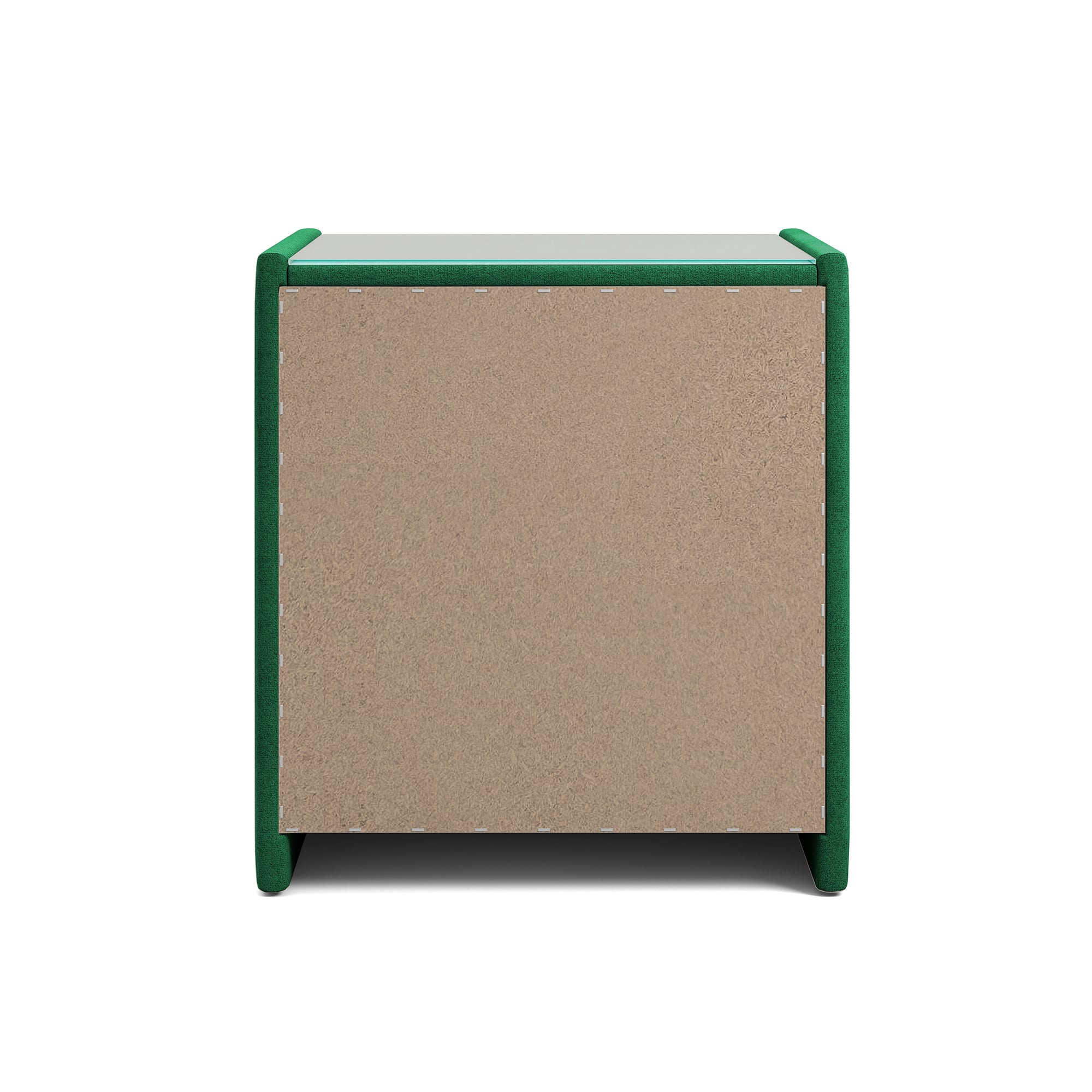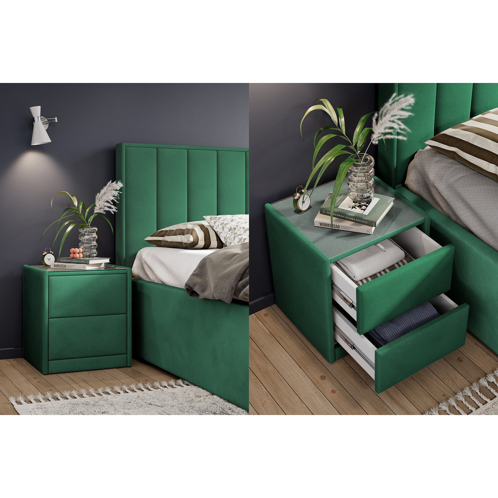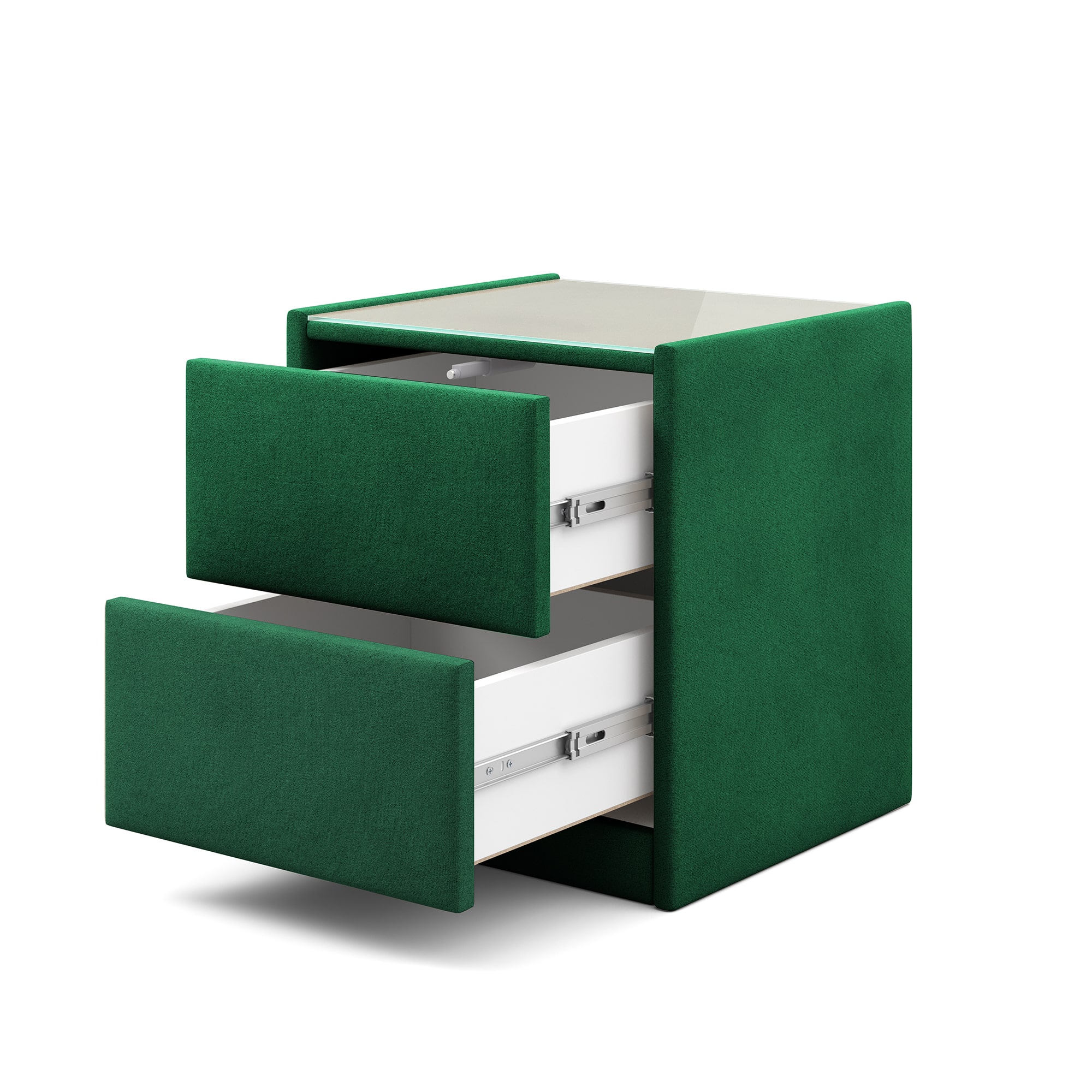 Тумба обтянута высококачественным велюром, что придает ей особый уют и комфорт. Имеет стеклянную столешницу и два вместительных выдвижных ящика с механизмом Push to open. Скругленные торцы модели, минимизируют риск удариться в темноте.
