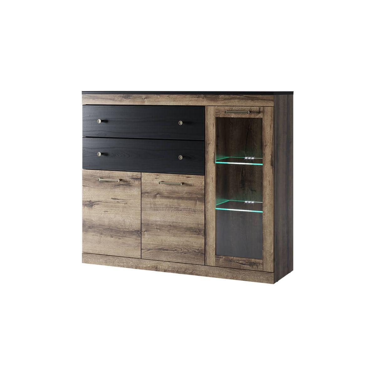 Материал: ЛДСП – 16 мм, цвет – дуб монастырский 375 SWN, ЛДСП – 18 мм (фасады выдвижных ящиков в цвете чёрный 660 WML), закалённое стекло – 4 мм (витрина в рамке ЛДСП).