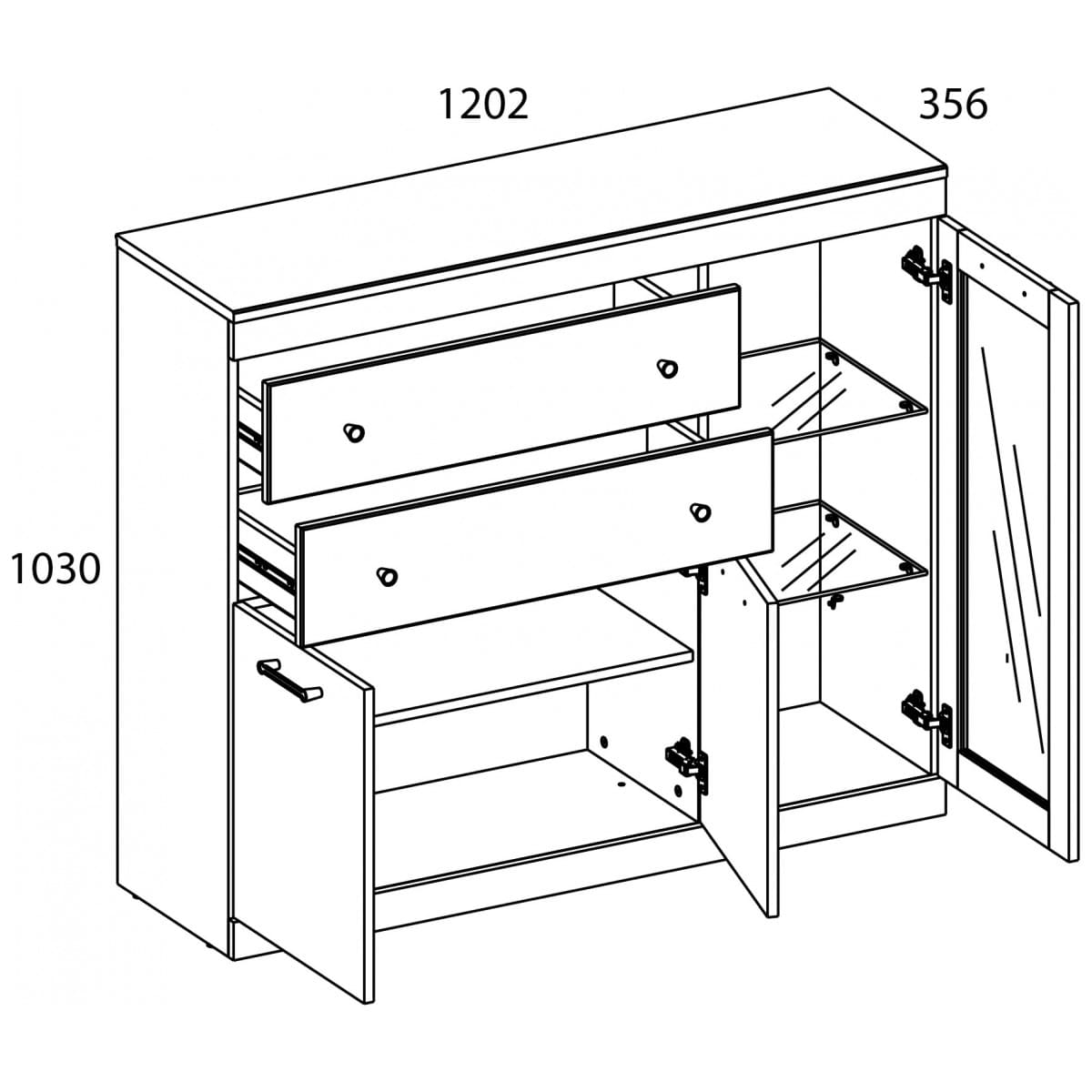 Тумба 1V2D2S JAGGER создаст интерьер гостиной в едином стиле с другими элементами коллекции. Также, модуль возможно устанавливать как самостоятельный предмет мебели, так и в общем наборе с другими элементами коллекции. Тумба 1V2D2S имеет прямую конструкцию. Конструкция элемента представляет одно отделение с полками из закалённого стекла за витриной (1V), отделение с полкой из ЛДСП за двумя глухими дверями (2D), два выдвижных ящика (2S). Витрина и двери - распашные, крепятся на петли к боковому корпусу изделия и к внутренней перегородке. Такой элемент организует компактное хранение декора, памятных вещей, книг, фото, документов, посуды, салфеток и скатертей.