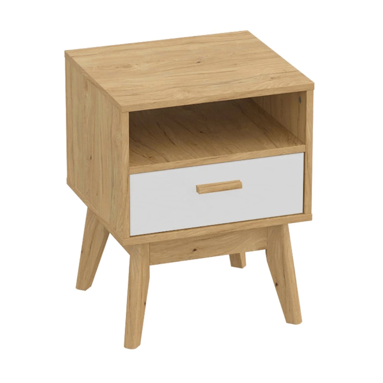 Эта тумба проста и элегантна, она отлично впишется в любой интерьер. Фасад из белоснежного МДФ в сочетании с корпусом из ЛДСП цвета натурального дуба создаёт ощущение лёгкости и нарядности. Ручку ящика выполнили из массива берёзы.