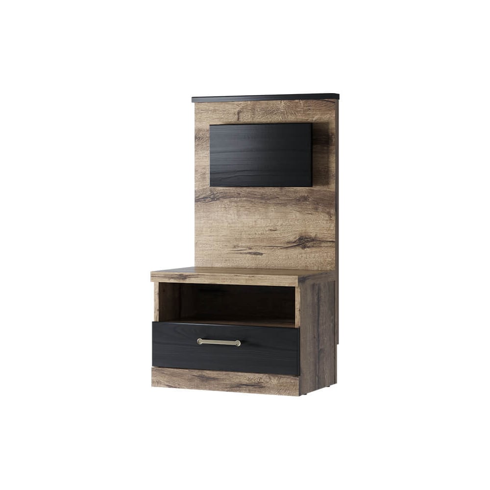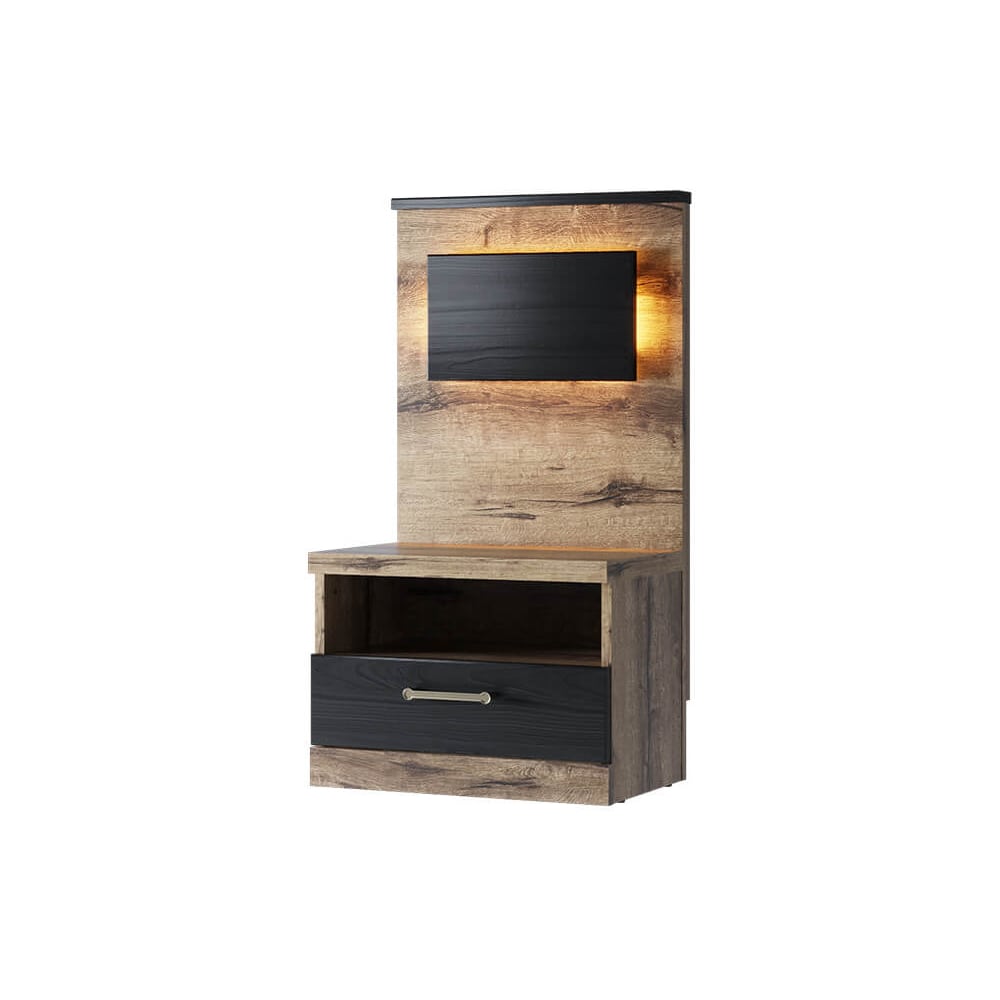 Тумба прикроватная JAGGER 1S. Необычный дизайн прикроватной тумбы, которая имеет одинаковую высоту с изголовьем кровати, создаст стилистический сюжет и дополнит общую композицию интерьера спальни. Тумба прикроватная 1S имеет прямую конструкцию. Конструкция элемента представляет собой открытую нишу под верхним щитом, один выдвижной ящик (1S). На задней стенке изделия расположен декоративный элемент в виде прямоугольника (фальшпанель), за которым возможно установить подсветку.
