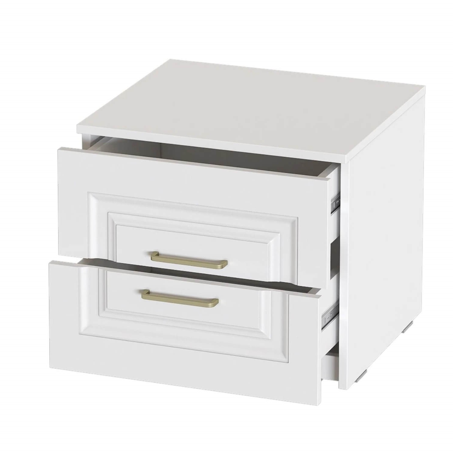 Тумба выполнена в цвете Айс 06 / Белый Аляска. Классическая фрезеровка фасадов и ручки-скобы из брашированного золота придают изделию особый шарм и элегантность. Тумба оснащена двумя ящиками полного выдвижения на шариковых направляющих, которые скользят бесшумно и плавно. Дно и задние стенки выполнены из ХДФ. На опорах размещены войлочные подпятники.
